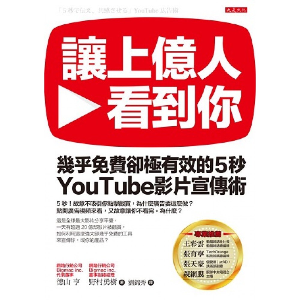 推薦序一 這是一個對影音創作者空前美好的時代 眼球中央電視台主播/視網膜 「各位好,這裡是眼球中央電視台新聞頻道,歡迎您走進本節的新聞直播間,我是主播視網膜。」這是我在每段網路影片中的標準開場白。雖然曝光平臺是在YouTube及Facebook(臉書),但多數觀眾卻將我們創立的「眼球中央電視台」,看作是真正的電視頻道;媒體報導中對我們的稱謂,也從「網友」逐漸轉為「媒體」。無論是YouTube、Facebook,都為影音內容創作者帶來許多機會。 在草創時期,眼球中央電視台對於內容的創作純粹抱持實驗的心態,從觀眾及網友的反應調整製作主軸或形式,從只有90人點閱到90萬人觀看,我似乎明白了一些經營網路內容的竅門,卻時常難以梳理或掛一漏萬。本書提及了許多讓我感到極具共鳴的重點,之中最有感的,莫過於「電視黃金時段的消失」。 一般傳統電視新聞的黃金時段,正是晚上六、七點的「晚間新聞」。在有了網路之後,線性收視習慣已被網路破壞,觀眾隨時可以到網路上點選新聞,或在自己的閒暇時間選擇網路上的完整節目。YouTube確實成了電視系統臺,我們的頻道也因而成了電視頻道,且擁有隨時隨地能讓觀眾選擇收看的豐富內容。但在沒有豪華硬體設備的情況下,內容的「創意」便在傳播效果中扮演更重要的角色。 無論是哪個時代、運用何種傳播平臺,我都深信「內容才是王道」,本書也向讀者介紹並傳達「共鳴」的精髓。內容有了一定的強度,周邊的數據收集或廣告分析也會找上門來。這就像是滾雪球一般,效益將隨內容經營的程度越滾越大,前提是必須對自己要經營的內容軸向有清楚認識,也得為往後永續經營鋪路,預先了解廣告模式的關鍵技巧。本書在頻道經營訣竅的論述豐富度,已經超乎我原先能想到的範疇,是一本值得收藏的工具書。 也許YouTube或Google會有凋零的一天,Facebook與Yahoo!也會有沒落的時刻,但無論未來傳播載具如何變化,這些書中所述的功夫都能一直帶在身上,也能為有心洞悉網路傳播的同好們提供不同的角度。只要有心,人人都能在這個對影音創作者空前美好的時代裡,走進自己的新聞直播間! 推薦序二 能打動顧客的心,網路戰略就會成功 優愛德(urAD)技術部副總/張天豪 如果你以為這本書只是在描述YouTube平臺與影片廣告,那就大錯特錯了。 作者德山亨及野村勇樹在書中有條理的歸納、分享了在數位媒體領域的知識和實作經驗,藉由實踐這些方法,更能幫助廣告主了解並從顧客需求的角度切入,規畫適當且可評估的行銷戰略,創造能引起收視者共鳴的影片,並利用最佳的廣告投放方式將效果極大化,全書內容既清晰又切中要點。 由於網路的發達和廣告的興盛,全世界興起一波數位經濟的浪潮,數以萬計的企業投入大量的人力與資源。身旁也有許多朋友乘著這波巨浪、創立自己的企業,並取得不錯的成績。 回想過去幾年,每到一個新的場合或是認識新朋友,只要知道我在數位媒體領域工作,除了基本寒暄之外,大部分會問的問題不外乎是:「你們怎麼收費?」、「現在在網路上打廣告,要多少錢?」、「哪種廣告的效果比較好?」等主題。極少會有朋友與我討論,該如何利用不同的行銷戰略和媒體策略了解客戶偏好,並進一步增加與客戶互動的機會。 當我問起公司產品的核心策略和行銷主軸時,對方往往沒有正面的答案,許多行銷人員對廣告市場的看法或結論都是聽來的,並非由經驗學習而來。讓我不禁好奇,還有多少企業在執行以往的各類行銷規畫方法? 仔細觀察數位趨勢,並比較各個產業的差異後,我發現這歸咎於整體社會的「速食化」。連企業中的經營管理、市場研究、行銷業務都速食化的時候,企業很難會有耐心去聆聽顧客的聲音、了解顧客真實的心聲。 這也是為什麼大部分的企業會問「如何打廣告最有效」,而不是「如何打動顧客的心」了。關於這一點,本書很清楚的說明了網路戰略的重點,要能成功打動顧客的心,必須整合多種要素,而非單一廣告所能達成。 我將這本書推薦給所有的朋友,不論你來自哪個產業,也不論你在企業中擔任哪一種角色,企業主可以清楚了解趨勢與評估方式,行銷主管可以強化企業在行銷上的整體戰略,行銷人員也能妥善執行與評估適當的行銷方案。尤其是想要在網路上創業或進入這一個領域的朋友,仔細閱讀書中的關鍵重點,你一定會跟我一樣受益良多的。 推薦序三 想「讓上億人看到你」,除非你能說一個精彩的好故事 動腦雜誌社社長/王彩雲 近年來,各式各樣的行銷方式層出不窮,影響所及,傳統的溝通模式每況愈下。但重點是,如何能讓人隨時隨地找到你的品牌,而且能深深打動目標對象的心。 《讓上億人看到你》這本書的推出,剛好因應了新時代來臨的新媒體運作。許多從事品牌行銷的人在想,我們花那麼多廣告費買電視廣告時段,不如拍一部感動人心的片子上傳到YouTube,不但可隨時搜尋,還可透過各式各樣的通訊軟體,轉發給你的好友,這樣物美價廉的行銷方式,讓許多品牌經營者愛不釋手! 銷售隨身碟等商品的金士頓(Kingston)就非常懂得說好故事,不管是《記憶月臺》、《記憶的紅氣球》⋯⋯這些經典的好故事,常常讓許多人一看再看! 不過,想讓目標對象對你有興趣,你必須說一個好故事,這個故事不但要有趣,還要讓人意想不到。例如,Dentsu SPAT電通新極現的執行副總詹朝棟為華歌爾拍的片子,影片