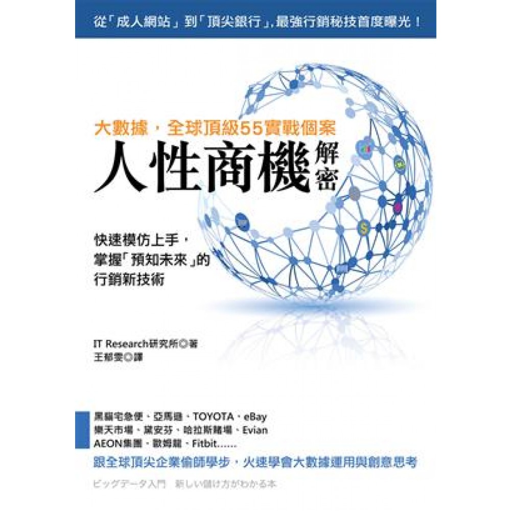 1+2=10!! 這本書幫你換上「大數據腦袋」!! 美、法、日、韓…全球55個實戰「圖解案例」,不熟大數據也能快速模仿上手!! ★從成人網站、賭場、超商到頂尖銀行,最強實戰範例解密曝光 日本著名IT Research研究所,深入淺出說明全球最強55個大數據實戰個案,分析各行各業背後的創意邏輯,並歸納出成功應用大數據的共通點──大膽假設。 本書帶你思考這些案例如何轉化到自身工作上,率先抓住未來的大數據商機── ♦日本成人網站推算影片「高潮畫面」時間,幫會員盡快滿足「真正目的」,同時釋放頻寬和降低成本 ♦拉斯維加斯賭場運用全球客戶資料庫,現場偵測輸錢顧客,指示貼心服務讓他願意再賭一把 ♦樂天市場用最短時間將電視節目與廣告內容轉成關鍵字,抓住網購浪潮的「黃金七分鐘」 ♦法國「HAPIfork」餐叉,能感應用餐速度,發出「吃太快」的提醒,並根據進食節奏估計攝取的熱量 ♦華歌爾「魔鏡」(Love Ageing Mirror)裝置,利用累積四十五年的女性體態資料,可演算出顧客十年後的身材變化 ♦美國Zest Finance財務徵信系統,透過被徵信者的網路消費與瀏覽記錄,分析可否高額貸款 ♦亞馬遜網路書店愛用「A/B測試」,決定要採用的網頁或服務版本 ♦Evian礦泉水品牌免費提供「Smart Drop」無線訂購裝置,讓顧客貼在冰箱上,從源頭阻絕競爭對手的干擾 ♦日本AGI「感性測定技術」與任天堂合作,比對「情感」聲音波形資料庫來打怪闖關。 ♦大廣超市「DLabHook」系統,顧客拿起架上商品,面前螢幕會顯示更多資訊,提升加購機率。 …… ★偵測「數位足跡」,「量身訂做」貼心服務的時代到了! 用Google搜尋、玩臉書打卡、網路購物、瀏覽新聞網站或部落格……人們的一舉一動正在加入有史以來最龐大的資料礦藏,成為「大數據」的一部分。這些數據不只是無機的0與1組合,其中蘊藏的是人們的個性、情感,以及改善生活的好點子。 例如購物記錄與感應裝置的連線,可讓商品陳列架上的螢幕即時推薦顧客平常喜歡的購物組合,或是促使顧客想到補充即將用完的隱形眼鏡和生理用品。除了資料庫的活用,現在有項服務是上傳臉部照片,眼鏡商便可將臉部輪廓數位化,用3D列印機「印」出保證最符合臉型的客製化鏡框,然後安裝鏡片、快遞到收貨地址……顧客根本不用出門! 還有,只要透過電話,情感解析技術就能根據不同情緒形成的特殊聲音波型,協助判斷說話者是否有憂鬱症的可能性;這套技術除了受到許多日本企業採用,亦實用於日本311震災後的心理輔導。其他像是睡眠品質、交通安全、居家護理、政府開放資料……都是大數據的應用範圍。 ★巨量資料偵測人性行為,預先掌握未來新商機 大數據不只是科技界的新玩具。食、衣、住、行、醫療、娛樂……日常生活中,可以看到愈來愈多企業想出活用大數據的策略,作為提升利潤與增進工作效能的實用工具。說不定你家附近的便利超商,就是依照大數據調查的結論,而在店內引進冰淇淋、咖啡機等服務,或是把女性雜誌移到靠近店門口的地方,旁邊還擺了剛訂做的藥妝小櫃,以吸引更多的女性顧客。 大數據是全球網路人口的行為累積,量變帶來質變,傳統產製思考模式所無法理解的商機就隱藏在資料裡。預測人性,做出大膽創新的假設,結合尚未找到實用方式的新科技,將是推出殺手級應用的不二法門。 本書特色 ★55個全球頂尖案例,不熟大數據也能從模仿中學習 ★圖解各國企業機構的大數據活用個案,深入淺出解析說明 ★歸納出大數據時代需要的思考與工作方式