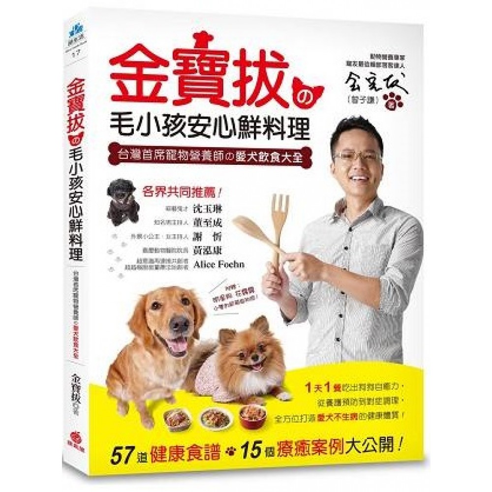 推薦序 1 用金寶拔正確的鮮食觀念,給「巧克力」好好的照顧! 嘿嘿,厲害了!我這隻5歲的紅貴賓──巧克力,是我家的老大,整天在我和老婆芽芽間打轉,也很愛跟老婆和女兒爭風吃醋,有次老婆想親我,牠也在旁邊狂吠不已!還有一次,那時小孩剛抱回來,家裡簡直就是災難,我只要一抱小孩,牠就氣呼呼的跳上跳下;小孩一哭,牠就如臨大敵,我像裁判一樣常常要把他們當選手一樣分開。面對牠的躁動,去年我曾求助節目製作單位,完成馴服狗狗的超級任務。我當時心裡只有一個想法「專業就是不一樣,透過專業協助會更容易上手。」 飼養狗狗更是如此,從以前我就是餵鮮食,反正家裡有什麼,巧克力就吃什麼。後來經朋友介紹,認識了金寶拔,才知道餵養毛小孩有撇步,就像老師說的牠們需要比人類更多的動物性蛋白質,此外蔬菜、澱粉也要均衡補給,不能讓狗狗偏食,否則會影響牠們的健康! 我跟大家分享一個小故事,有一次晚上睡覺時,我擔心巧克力不小心弄傷睡在嬰兒床的女兒,就抱著牠睡在床上,有一天驚醒,牠不見了,我簡直嚇壞了,後來發現牠站在嬰兒床邊,眼光慈愛地看著女兒,就像是在保護她。那一刻我發現我錯了,很多人以為狗狗跟寶寶不能並存,就把狗送人,甚至棄養,其實有時候寶寶過敏體質,跟狗在一起反而會增強抵抗力。巧克力在我心中是老大,女兒是老二,所以我希望能教會巧克力聽話、保護牠的妹妹(我的女兒)。 綜藝鬼才 沈玉琳 推薦序 2 讓毛小孩吃得健康,陪你更長久! 「狗是人類最忠實的朋友!」一直以來,我都很喜歡小動物,不論是節目錄影、朋友的狗狗,我總喜歡去摸牠們、和這些可愛的毛小孩們互動。 經由朋友轉介認識金寶拔,對於他投入照顧狗寶貝的心力和時間相當敬佩,例如:他為了更瞭解寵物營養學,特地到美國攻讀營養學碩士;現在,更進一步到內地研究「寵物漢醫」,不論是把脈、針灸和這本書提到的狗狗14經絡及排梳按摩法,皆是讓我大開眼界啊! 看到書上57道佳餚菜色,不難想像金寶拔為了讓毛孩們可以吃得健康又營養均衡,耗費多少腦力和心力,如此美味的佳餚,連我都想吃了!肯定是「粉香、粉美味」! 本書《金寶拔の毛小孩安心鮮料理》深入淺出,絕對值得家裡有養狗,或愛狗人士,甚至開寵物餐廳的朋友們參考,因為要讓毛寶貝們吃得健康,才能陪你長長久久! 知名主持人 董至成 推薦序 3 如果我早一點有鮮食觀念,或許愛犬就能活得更健康、長久! 沒有人喜歡生離死別,特別是讓人措手不及的那一種。我們家的柯基犬──黑糖,從生病開始到離開只有短短的2個月,真的太快了!我連一丁點心理準備也沒有,牠就到天堂去當天使了。 我想起醫生曾跟我說,狗狗胰臟炎的原發因子其實很多,跟其他疾病相較起來,也較難以預防,因此平時的居家飲食、養護上應格外注意。發病後,黑糖的胃口變得很差,什麼都不肯吃,我只能用餵食管強迫餵牠吃進流質營養品,現在回想起那段日子,真的很悲慘,我看著牠帶著淚的杏桃眼,很勉強的吃進流質營養品,我也跟著掉眼淚。 坦白說,當時的我對於寵物鮮食是沒有任何概念的。如果我能早一點認識鮮料理,或許黑糖的最後兩個月不會過得那麼痛苦,又或許我可以一開始就能親手做鮮食,讓黑糖寶貝能吃進滿滿的愛與營養。因此我希望,更多人能藉由這本書,學習到正確飼養愛犬的方法;也希望所有毛小孩,都能健康快樂的活著。 外景小公主、知名主持人 謝忻 推薦序 4 小寵物們應與人類一樣獲得「擇食」權,請提供天然食物協助牠成長! 這幾年在為「小動物超越極限能量療法」編寫課程期間,經朋友介紹認識了Peter(金寶拔老師),我對他的專業很感興趣,並找了機會向他討教一些狗狗的飲食營養知識。Peter是台灣第一位動物營養師,他在如何正確地對待並照顧寵物的理念和我是一致的。我們都注重動物身體的特性與需要,對於家中寵物的飲食和身體關係都抱著相同意見。看到他的這本書《金寶拔の毛小孩安心鮮料理》初稿,裡面的七彩畫面、詳細的烹煮細節和視覺效果,比起人的食譜有過之而無不及,書中的各式食譜和詳細說明,還有非常華麗的食物擺盤,看起來好吃極了!我發現他的食譜其實也都適合人類享用。 寵物因為處在我們提供的食物和環境中生活,喪失了本身擁有通過食物去療癒自己的功能。我們可以用健康的食物去輔助這方面的缺失,不只是給乾糧,也請提供自製的手工食物,協助狗兒取得自然的營養均衡補給。 Peter也曾提過:「我家13歲的狗Kibi,除了每天吃一部分適量的乾糧之外,還會喝一些脫脂牛奶,或吃新鮮的水果、蔬菜和自製的肉乾、水果乾、餅乾作為零食。13年來,除了小時候從桌子跳下時扭傷了腳關節,和今年因為家裡裝修需要暫住動物托養所,因分離焦慮症而發燒,需要醫生照顧之外,身體從未有任何不適。 當然,我認為每天2次的散步、每週1次的健行和海浴也是健康的因素之一。我記得Peter曾經用特別調配、親研的鮮食譜,調理好一個患了嚴重疾病的寵物個案。我曾嘗過他為小狗狗們的派對食物,覺得那些食物都很豐富、美味。通過均衡的食物,你的小寵物們會活得更健康快樂! 超越極限能量療法始創者、超意識再連接共創者 愛麗絲‧馮(Alice Foehn) 推薦序 5 金寶拔堪稱「寵鮮食主義」代表人物,和獸醫師並肩守護毛小孩的健康! 到了1990年代後期,隨著社會經濟的發展,人們生活的型態與對寵物的消