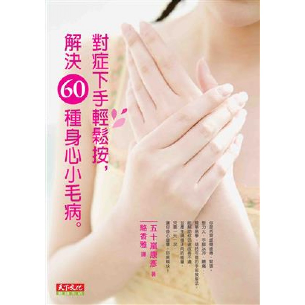 前言 相信許多人都曾經有過肩膀僵硬、頭痛、手腳冰冷、身體浮腫、經痛等不適症狀的困擾。疲勞或倦怠感等症狀雖然不是疾病,但總會讓人覺得不太舒服。這時候,我想推薦本書介紹的手部按摩保健法,也就是反射刺激療法。 以反射刺激療法為基礎的手部按摩,特點是隨時隨地都能施行,對於頑強的慢性症狀亦具有舒緩效果,防病於未然,調整身體恢復到健康的狀態。不需要特別的工具或技術,無論是通勤途中或是零碎空檔,皆能輕鬆的按摩手部,很適合生活忙碌的人。 雖然只是按摩手部,卻可以促進體內的新陳代謝,連帶具有美肌及美髮的功效,且有助於從根本面徹底改善體質,減輕便祕或腹脹等因個人體質所產生的症狀。以反射刺激療法為基礎的手部按摩完全沒有副作用或不良影響,效果顯著,請務必親身感受它的神奇效果。 多年來,我行遍世界不遺餘力鑽研有效的治療法,發現區域反射療法(Zone Therapy或Reflexology)的效果十分顯著,並致力成為該領域的先驅者。區域反射療法亦稱為反射區療法,它的功效在美國、歐洲及亞洲均獲得認同。 手部反射區按摩法是我綜觀古今東西方各種治療法所研究出的方法。在本書中依照症狀別,將全新歸納研發的手療法搭配按摩位置、按摩方法以及按摩時應注意的重點,一一詳加解說。除了手部反射區,書中也一併介紹具有相乘效果的手部穴道及足部反射區,同時按摩效果倍增。 這是一本適合隨身攜帶並加以活用的工具書,衷心期盼人人都能夠擁有健康的生活。 五十嵐康彥