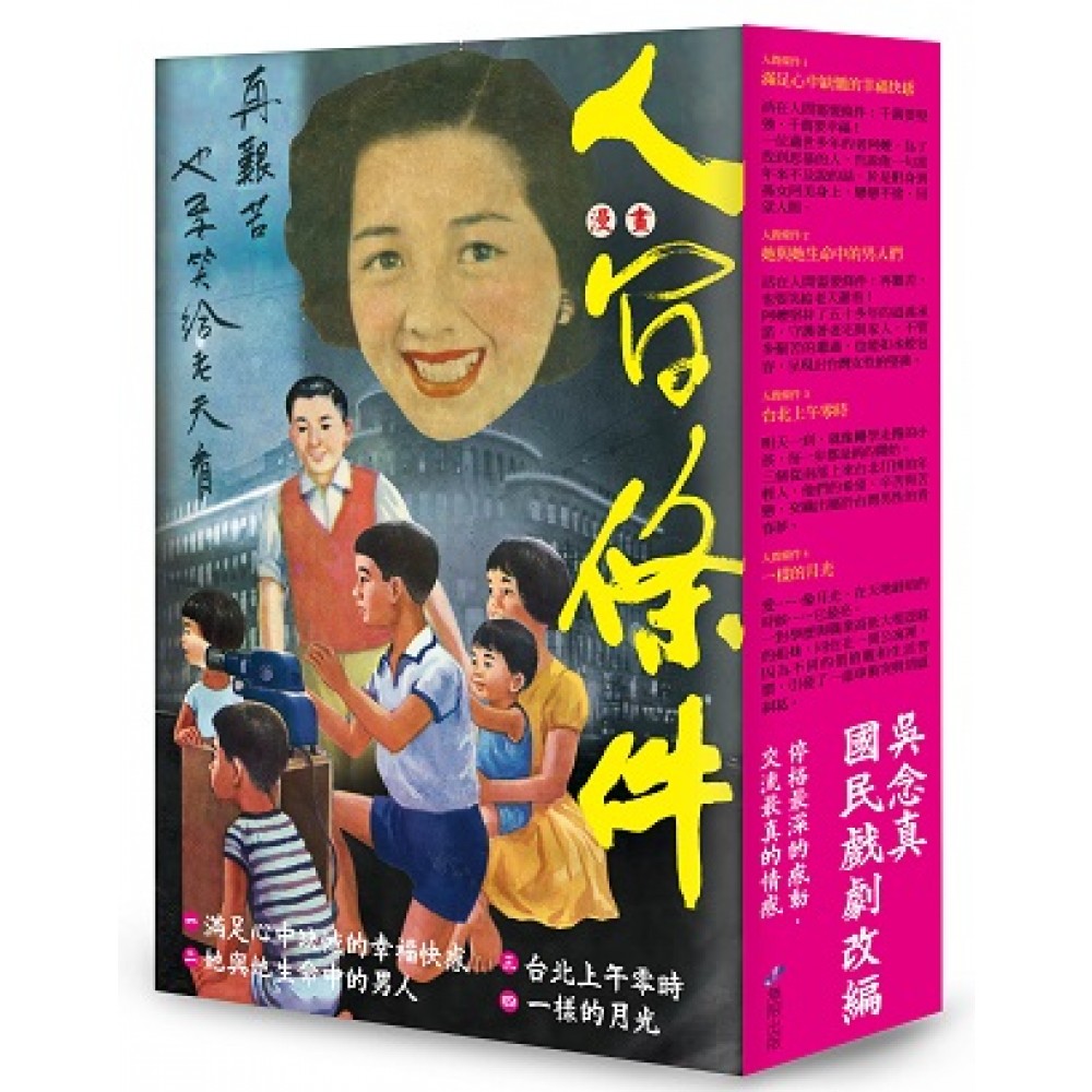 停格最深的感動 • 交流最真的情感 不說教、不喊口號,以最平實的方式、最親近的語言說故事的舞台劇《人間條件》系列,被譽為台灣「國民戲劇」,自2001年首演以來,感動成千上萬人,不僅場次、票房屢屢刷新記錄,更締造了台灣劇場的新氣象,讓看戲變成人與人之間情感交流的儀式,彼此分享人生的悲喜。 漫畫版《人間條件》保留原汁原味的真情真意,更進一步突破舞台劇的侷限,藉由更寫實的時代場景、更細膩的情感鋪陳,將本系列特有的庶民生活,描繪得更淋漓盡致,而不限時空的閱讀方式,更適合普羅大眾珍藏。 人間條件1 滿足心中缺憾的幸福快感 活在人間需要條件:千萬要堅強、千萬要幸福! 一位過世多年的老阿嬤,為了找到思慕的人,告訴他一句當年來不及說的話,於是附身到孫女阿美身上,戀戀不捨、回望人間。 人間條件2她與她生命中的男人們 活在人間需要條件:再艱苦,也要笑給老天爺看! 阿嬤堅持了五十多年的道義承諾,守護著老宅與家人,不管多艱苦的遭遇,也能如水般包容,呈現出台灣女性的堅強。 人間條件 3 台北上午零時 明天一到,就像剛學走路的小孩,每一步都是新的開始。 三個從南部上來台北打拼的年輕人,他們的希望、辛苦與苦戀,交織出屬於台灣男性的青春夢。 人間條件4 一樣的月光 愛……像月光,在天地最暗的時候……它最亮。 一對學歷與職業高低大相逕庭的姐妹,同住在一間公寓裡,因為不同的價值觀和生活習慣,引發了一連串衝突與情感糾葛。