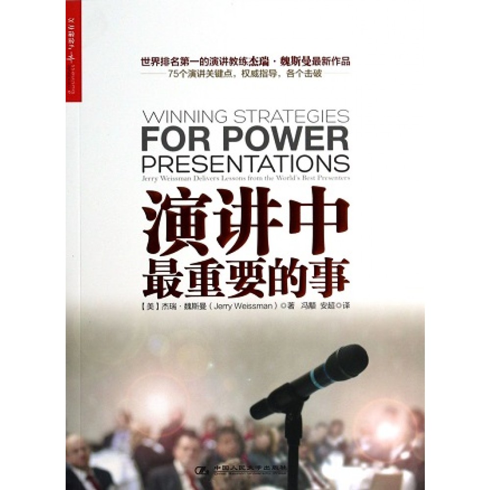 经常有人在微博上问起关于演讲的问题,每每回答,我都会说:“建议去看看我的演讲老师杰瑞·魏斯曼的书吧!”魏斯曼先生是我个人非常尊敬的演讲教练。无论你是身负IPO路演重任的公司管理者、频繁出席商业活动的商业人士、经常遇到危急时刻的政治家、销售员或明星,还是害怕演讲又关心演讲的普通人,都将从这套书中获得不一样的视角和经验。魏斯曼通过实践告诉所有人:强大的演讲与沟通技能并非天生,而是可以后天塑造的。 ——李开复 创新工场董事长兼CEO 沟通能力对一个企业家的成功起着决定性的作用,而演讲也是每个企业领导者领导力的重要表现。美国排名第一的演讲大师杰瑞·魏斯曼的这本新书以其丰富的演讲教练经验向世人全面展现他的思想精华所在。对于每个想提升自己演讲或公众沟通技巧的人来说,这本书都是必读书。它会为你的事业打开新的局面,帮你克服演讲的恐惧和思维局限,这将是你读过最好的演讲指导书。 ——林强 Wacom 中国总裁兼CEO “你所说的和听众所理解的不见得一样!”这是魏斯曼先生书中提到的一个演讲基本原则。作为一个互联网金融行业的创业者,我对此深有体会。无论是大型公众演讲、公司内部会议还是与合作伙伴交流想法,每一次发言之前我都要想一想,要传递的信息能否被听众正确接收?魏斯曼先生把这个原则应用到他自己的演讲中,同时也提醒我们要从听众角度审视我们要传递的内容以及表达方式。仔细学习这本书中的75节课,必将为你的下一次演讲带来莫大的益处。 ——李欣贺 人人贷CEO 东方智慧说“讷于言敏于行”,西方人也常说“事实胜于雄辩”,其实总有一个时候你不得不相信,一次关键性的演讲或者面谈,足以改变你、你的企业,甚至你的国家的命运(例如《国王的演讲》)。Presentation是人们既爱又怕的商务活动,讲得好的人更易吸引眼球,容易获得成功。面试、会议、提案、路演等关键情境,始终离不开一场漂亮的presentation,想为自己加分就得认真准备。仔细阅读这本书,总有个一刻你会感激它! ——王刚 资深财经媒体人,暴风影音副总裁,《非你莫属》Boss团成员 高管团队的Presentation在IPO路演推介过程中承担着非常重要的角色。在30分钟内,如何呈现一家新公司的投资亮点,让充满疑虑的投资者记住你、信任你,并转化为购买行为,是CEO们面临的重大挑战,也是“字字千金”的直接体现。杰瑞·魏斯曼在本书中总结了若干清晰而有效的指导,也最好地总结了我们的实践经验。 ——唐坤 资深财经传播专家 作为全球最大的公众演讲训练组织的资深成员,很多周边的朋友都通过演讲训练得到了职业发展的极大提升。很多人都问我类似的问题,怎样才能更快、更全面地领悟和掌握Presentation的精髓。这方面的书籍汗牛充栋,但是像杰瑞·魏斯曼的这本新书如此直接、实用而且具有高度的却很少见。他不愧为全美排名第一的演讲教练! ——程龙 Toastmasters国际演讲会D85区教育培训总监,畅销书《演讲达人成长记》作者 在个人沟通能力的指导方面,杰瑞·魏斯曼是当之无愧的世界上最好的导师。我与他相识、共事多年,我认为《演讲中最重要的事》是他众多著作中最好的一部。如果你致力于成为一名有感染力的演讲者,它将是你的必读书目。你会从中得到极大的价值。 ——狄克森·多尔 DCM资本联合创始人 美国国家风险投资协会前主席 DIRECTV董事会成员 杰瑞拥有一种魔力,他能够将一名单调、乏味的演讲者变得让人神魂颠倒、万众瞩目、魅力无穷。他对演讲者的指导对于听众来说就像是一罐红牛一样提神。杰瑞的这本书章节精炼且富有感染力,对于任何一个需要做演讲或者演示的人来说都会有极大的帮助。 ——道格·利昂 红杉资本合伙人 杰瑞的这本新书是又一杰作!很高兴能够从掌握了演示艺术的人身上获得启迪。这本书里的观点会吸引我在以后的几年里反复翻看。多谢杰瑞让我们有了另一轮精彩绝伦的体验。 ——贝瑟尼·迈耶 惠普高级副总裁兼网络业务部门总经理