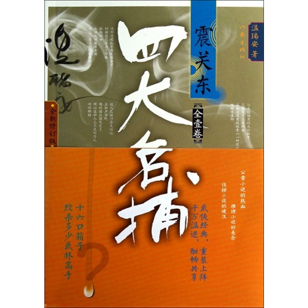 《四大名捕震关东(全1卷)(全新修订版)》为香港著名武侠小说作家温瑞安的处女作。在这部书中,名震天下的“四大名捕”首次出场亮相。名捕冷血追杀恶徒,血战于黑森林中;名捕追命为救侠士,亡命于大漠荒野。喜爱四大名捕的朋友们,读罢此书,方有得窥全璧之感。无情、冷血、铁手、追命为追查要案远赴关东,与关东群雄展开了一场又一场智慧与力量的较量。