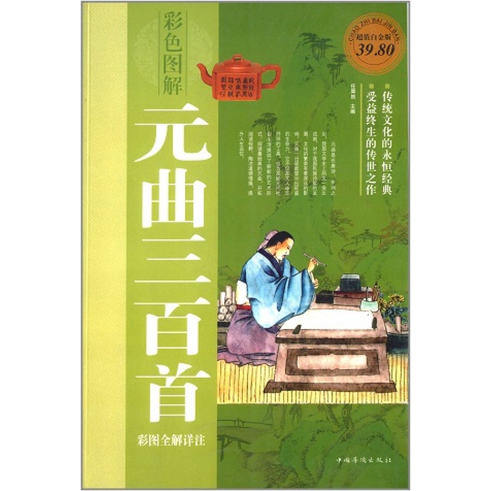 王国维曾说:“唐之诗、宋之词、元之曲,皆所谓一代之文学,而后世莫能继焉者也。”元曲是中华民族灿烂文化宝库中的一朵奇葩,它在思想内容和艺术成就上都体现了独有的特色,和唐诗、宋词鼎足并举,以其题材广泛、意境高远、语言通俗、音韵和谐、描绘生动,在中国文学艺苑中折射出璀璨夺目的异彩。 元曲拥有唐诗、宋词无法取代的本色魅力,它取唐诗之风骨,宋词之雅变,融当时之社会风貌,语言变得更加灵活,题材变得更加广泛,或泼辣或幽怨、或感慨或讽刺,风格多样,有哀婉典雅的闺怨情怀,有苍凉感慨的怀古之情,有激越悲壮的边塞之风,不一而足、雅俗兼容,因而深受人们喜爱,一代代中国人为之陶醉,其中不少名篇佳句脍炙人口。传诵至今。 《元曲三百首彩图全解详注(超值白金版)》是阅读、欣赏、学习元曲的理想读本,所选曲作既有出自大家之手、流传千古的名篇,亦有不见录于一般选本的遗珠,比较全面地展示了元曲的风貌。为了帮助读者更加深入、全面地理解原作,书中增设了作者简介、注释、译文等栏目,并对难解字进行注音,为读者扫除阅读障碍。同时,我们对每篇作品的写作背景、艺术特色、创作技巧等进行了细腻生动的解析,还为意境优美、蕴意深远的曲作配画,做到曲中有画,画中有曲。彩图、全解、详注,给你带来身临其境的阅读体验。