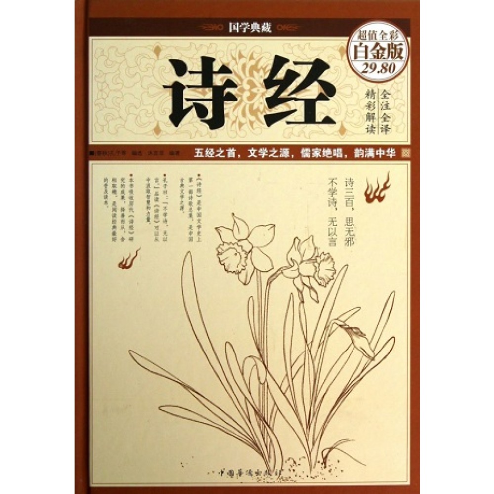 《诗经(超值全彩白金版)》共收录作品305篇,最初只称为《诗》或“诗三百”,它是中国文学史上第一部诗歌总集,向来被认为是中国古典文学之源,其现实主义的创作手法和多样式的文学风格,对后世文学影响极大,被后人尊奉为五经之一。它的内容十分广泛,几乎涉及了当时社会生活的所有方面,可以说它是西周初期到春秋中期大约五百年间社会生活的一面镜子。它以其丰富的内涵与深刻的思想性为我们描绘了一幅无比生动的社会历史画卷,是中华民族宝贵的精神文化财富,是绽放于世界文学巅峰之上的艺术奇葩。孔子曰:“诗可以兴,可以观,可以群,可以怨,迩之事父,远之事君,多识于鸟兽草木之名。”阅读《诗经》不仅可以加深我们对当时政治、经济、文化、历史和社会的了解,还可以开拓阅读视野,陶冶道德情操,提升人生品位,从中汲取到智慧和力量。 《诗经(超值全彩白金版)》收录了《诗经》的全部诗篇,并探讨了每一首诗歌的文化内涵,注释力求简洁明了,赏析力求准确流畅,是研读《诗经》的理想读本。
