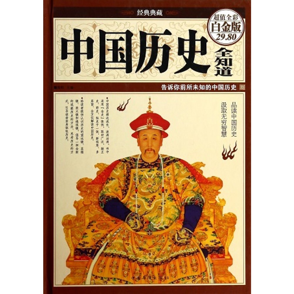 中国历史绵远流长,波涛汹涌,既有繁荣辉煌,也有曲折艰难;既有濯濯光明,也有血腥黑暗。为了反映历史的真相,让读者更加科学全面地解读历史,《经典典藏:中国历史全知道(超值全彩白金版)》采用“全史”体例,取材广泛,融正史、野史、秘史于一体,分为通史博览、野史追踪、秘史探究三篇,在真实性、趣味性和启发性等方面达到一个全新的高度,并通过科学的体例与创新的形式,全方位、新视角、多层面地讲述中国历史。它不仅给读者提供了认识历史的望远镜、显微镜、放大镜和透视镜,更重要的是倡导一种全新的观察历史的方法、思考历史的方式,给读者一双穿过重重迷雾、看透历史的慧眼。 不仅如此,《经典典藏:中国历史全知道(超值全彩白金版)》中精心选配了数百幅内容涵盖面广、表现形式丰富的图片,包括出土文物、历史遗迹、战争示意图、名人画像等,以大量精美图片传史之真,证史之实,辨史之误,同时使事件、人物更加立体丰满,并充满场景感。力求通过图文的紧密结合为读者提供一条回归历史真实的通途,做到融知识性、可读性、观赏性于一体。