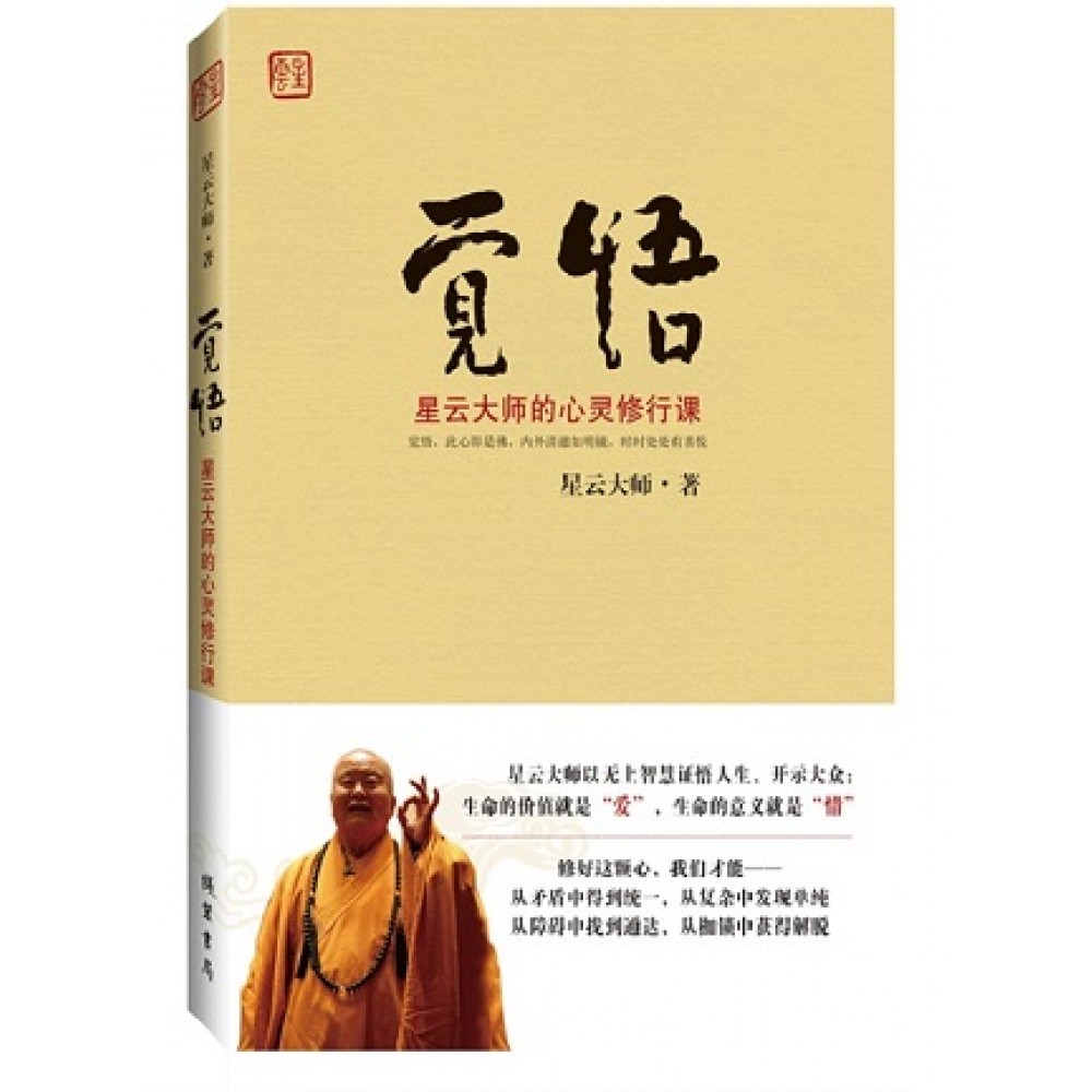 《觉悟:星云大师的心灵修行课》以“地水火风,缘起再生”的佛家智慧为根基,重新观照宇宙万物、自然生灵、人生诸事和个人修行,提出了“山河大地皆为佛体”、“日月风雷皆为佛用”、“花草树木皆有佛性”、“虫鱼鸟兽皆有佛心”、“芸芸众生皆有佛缘”的醒世正见,阐释了 “人与宇宙互为因缘、同体共生”的慈悲思想:惜生即是惜缘,护生即是造福,觉悟此心即是佛,方能在成住坏空的世界保持真如自性,从而达至个人修行的圆满和喜悦。