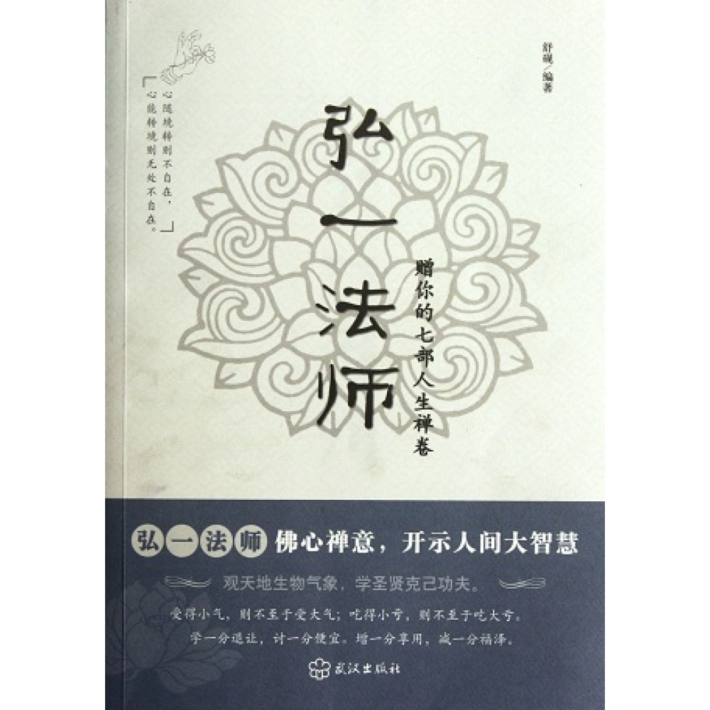 弘一法师曾说过:“谦退是保身第一法,安详是处世第一法,涵容是待人第一法,恬淡是养心第一法。” 弘一法师是百年难遇的奇才。从风花雪月的倜傥小生,到严谨大成的学术、艺术、思想大家,再到出家后长伴青灯古佛的佛学大家,绚烂之极而归于平淡。他叹:人如花,不久时;人如浮萍,无定处;人如烟花,现一时;人总归于一己,塌五大;人至山巅五他路;自古圣贤皆寂寞,悲欣交集。 弘一法师见过繁华五蕴皆空,苦心向佛,过午不食,精研律学,弘扬佛法。弘一法师开示人间大智慧,对人生、学业、事业、生活及修养心性诸方面进行分析和指导,启发众人如何面对社会上形形色色的人和事,摆正自己的位置,《弘一法师:赠你的七部人生禅卷》以历史上的成功和失败为例证,结合大师言论解说了如何正确对待金钱、物质、名誉、地位,以及如何处理个人与家庭、群体、社会,群体与群体之间的相互关系等。 《弘一法师:赠你的七部人生禅卷》风格清新质朴、别具一格、直指人心,突破了过往对佛法的解说和刻板的传统。是难得的励志经典。在漫漫的人世中走一遭,我们须有弘一法师的静心淡泊、旷达安然,方可达到那“梅开雪落寻常事,一容一枯报春来”之境,得失随缘,宠辱不惊。
