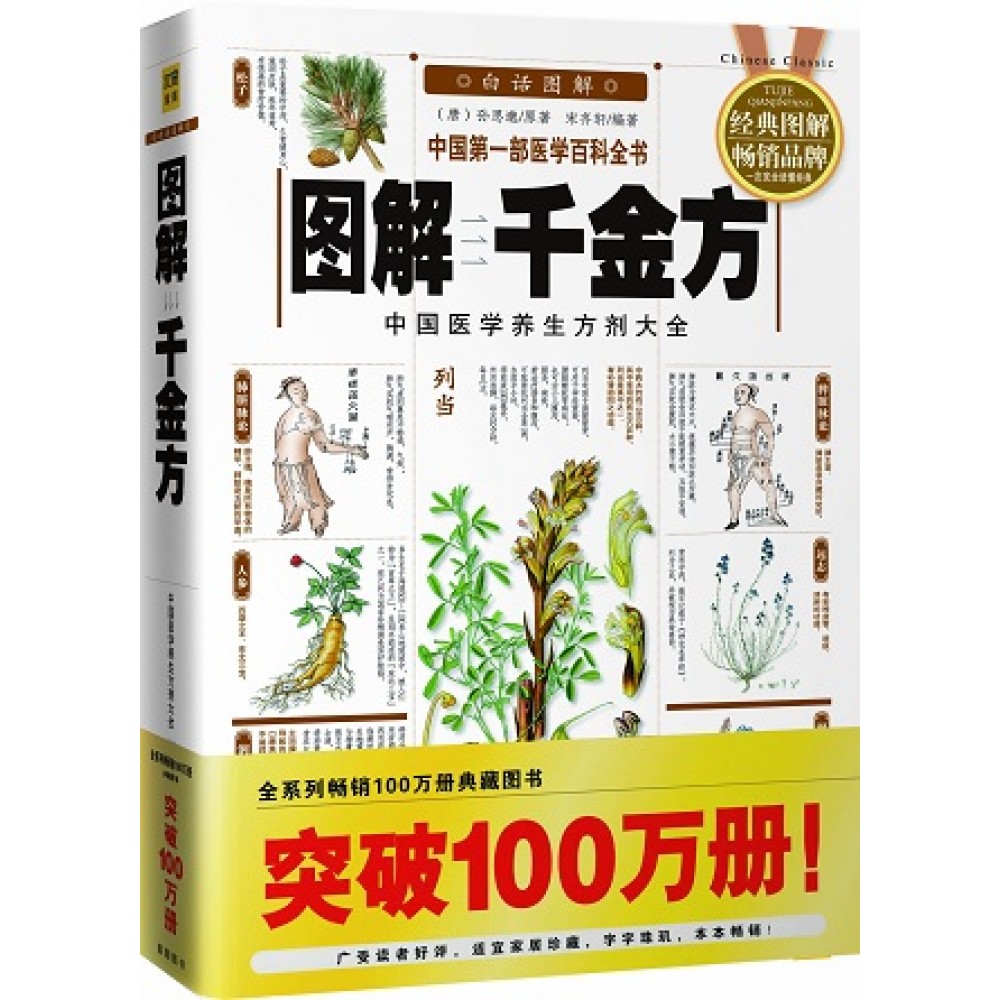 价值千金的中医瑰宝 《千金方》全称《备急千金要方》,也称《千金要方》,是我国唐代著名医学家孙思邈划时代的医学巨著,也是历代医家研究发掘医药学的宝库,在中国医学史上占有举足轻重的地位。《千金方》全书共30卷,汇集了晋唐以前大量医药学资料。内容包括医德、医学教育、治则、诊断、处方用药、妇、儿、五官、内、外、急救等各科诸病症,及食疗养生、房中、脉法、针灸孔穴等,总计232门,医方4300首。书中所载医论、医方系统地总结了自《内经》以后至唐初的医学成就,堪称一部价值非常高的医学著作。 孙思邈认为“人命至重,有贵千金,一方济之,德逾于此”,故将自己的两部著作均冠以“千金”二字,名《千金要方》和《千金翼方》。《千金要方》是我国最早的医学百科全书,从基础理论到临床各科,理、法、方、药样样齐备。一类是典籍资料,一类是民间单方验方,广泛吸收各方之长,雅俗共赏,缓急相宜。时至今日,书中很多内容仍有极高的学术价值,对医者行医起着指导作用,确实是价值千金的中医瑰宝,被后人称为“方书之祖”。 《千金要方》在疾病的预防、养生、食疗等方面都作出了巨大贡献。第一卷,诊候第四中记述了“上医医末病之病,中医医欲病之病,下医医已病之病……”的名言,可谓是《千金方》的精髓所在。孙思邈强调适应自然规律,增强体质:1.在未病的情况下,应积极防御。2.发展到欲病状态时,预防应被放在更加重要的位置,尽早调养,避免疾病的发生。3.一旦发展到已病状态,就要积极治疗和病后调养,以避免复发。 孙思邈十分重视妇女和儿童的疾病,认为妇女有经、带、胎、产等方面的特殊生理条件和疾病范围;儿童的身体结构与成人有很大不同,都应当单分出科,独立讨论。他也是最早提出将妇科单列一科的医家。在书中,孙思邈还将“妇人方”一卷置于篇首,足见他对此的重视程度。对于小儿,他主张衣服要软、不宜过暖、常晒太阳等养育方法,并对哺乳的时间、次数、乳量等方面知识进行了详尽的阐述,当之无愧是唐代对儿科贡献最大的医家。 孙思邈在药物学方面也有较高的成就,他十分注重采药的时间和制作方法以及药品的产地,在药材学方面亲自做了大量的实践和调查工作,对于不同时间采摘、不同方法炮制、不同产地药物的种种细微差别作了多方面的对比,在组方配药时,便对此提出了严格的区分和不同的要求。孙思邈还创立了根据药物的治疗功效对药物进行分类的方法,至今仍是临床医生最常用、最方便的分类法。由于对药物学的突出贡献,他被尊为中国历史上的“药王”。 为了能让“药王”这部医学巨著以最完美的现代方式呈现,以适合现代人的阅读品位和具有最大的实用价值,《图解千金方》对原著《备急千金要方》进行了一系列的编辑创新。文字方面:首先,删繁就简。由于原著篇幅过于宏大,编者本着实用的原则进行了精编,收录其中一至二十五卷的内容,并删去其中配药繁多、操作复杂的处方,只留下实用易行的一部分;其次,编者对书中每一医方中药味的用量,都换算出现代的克制、毫升等计量方式,以方便读者更好地阅读和使用。图版方面:首次对药方实例进行全面图解,别出心裁地将药方中每味药的实物图片放置圆盘中,并用优美逼真的人物牵线图形象表现服用此药方后的疗效,将中医药方清晰直观地呈现在读者面前;其次,提供了248幅精美准确的彩色手绘草药图,不仅方便自然爱好者按图索骥,在野外探寻药趣,也具备非常美好的观赏价值;再次,收集了大量医学实用知识,以“中医小锦囊”的形式对原书进行补充、丰富,为《千金方》增添了更新的实用价值。