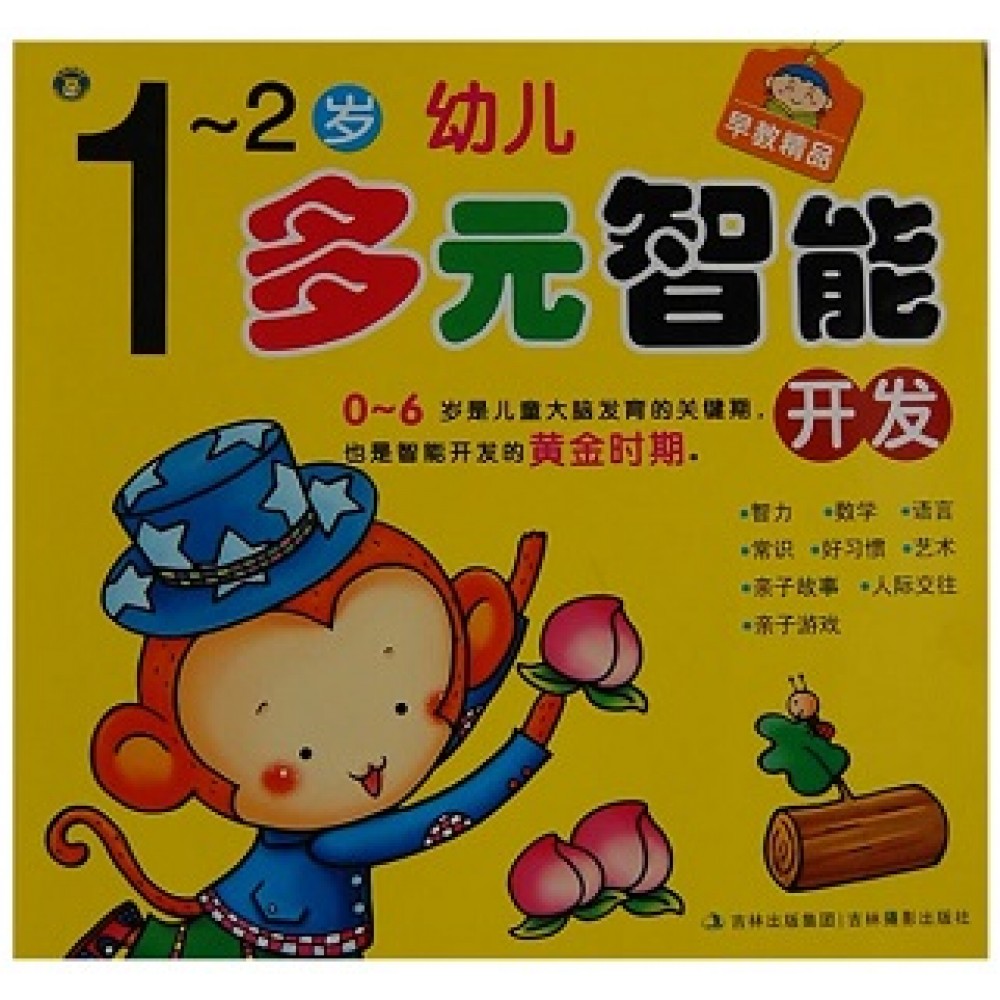《1-2岁幼儿多元智能开发》特色: 智力:注意力集中的时间变长,能够注意到事物间的明显差异;能够理解形状、大小、多少等概念。 数学:会数5以内数;初步理解数字。“1”和“2”的实际意义;已经具备了“圆圆的”“方方的”概念。 语言:能用简单的语句表达自己的意愿;可以用简单的词语回答问题;能说出爸爸妈妈的名字。 常识:能说出常玩玩具的名称;知道常用的生活用品的用途;认识常见的蔬菜和水果;能注意到自然环境的变化并产生兴趣。 故事:喜欢反复听自己感兴趣的简短的故事;对故事中反复出现的句子记忆深刻,并能记住简单的故事情节。 行为:懂得爱惜身体,知道不把脏东西放进口内;形成固定的生活习惯,能主动坐便盆大小便,能基本做到不尿裤。 人际交往:会正确地称呼身边的亲人;开始学会用表情来表达自己的情绪;喜欢接近其他宝宝,并能在成人的看护下游戏。 艺术:愿意配合家长完成简单的图画作品,如手印画等;对音乐的刺激表现积极,能伴随音乐摆动身体。 肢体协调:平衡能力逐渐增强,能独立行走;随着运动量的增加,活动范围也有所扩展;手部肌肉进一步发育,能轻松完成撕纸、捡细小物品等事情。