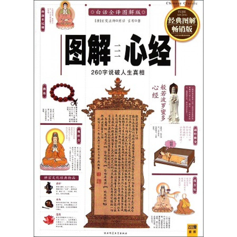 编者序 养疗心病的良药 “色不异空,空不异色,色即是空,空即是色”,这句意远旨深,千古传颂的玄妙经句,即是出自《心经》。《心经》全称《般若波罗蜜多心经》,梵文Prajnaparamitahrdayasutra,又略称《般若心经》,经文只有260个字,在佛界的地位却举足轻重。它和《金刚经》一样,在佛界广为流传,是《大般若经》的一部分,并被认为是600卷《大般若经》的心髓。《大般若经》由唐玄奘翻译,为大乘般若类经典的汇编,号称“诸佛之智母,菩萨之慧父”,其作为大乘佛教的基础理论,它的中心思想主要说明诸法“性空幻有”的道理。性空,指佛所说的一切法(即一切现象)都没有实在的自性;幻有,指一切法虽然自性空,但并非虚无,假有的现象仍然存在。认为世俗认识的一切对象,均属“因缘和合”,假而不实;唯有通过“般若”对世俗认识的否定,才能把握佛教真理,达到觉悟解脱。260字的《心经》不但涵盖洋洋600卷《大般若经》的微言奥义,并且还将佛教思想的核心概念完整呈现了出来。如:五蕴、六根、六触、十二处、十八界、十二因缘、四谛、六度、究竟涅、阿耨多罗三藐三菩提等。如此简练的经文,包含的佛教内容却如此丰富,因此被佛教徒信奉为圭臬,尊为成佛的指南,利生的法宝。寺庙的早晚课诵本中都有其编录,将它作为早晚必诵和常诵的一部经典。这部经典最早是由后秦著名法师、译经家鸠摩罗什传入汉地的,名为《摩诃般若波罗蜜大明咒经》,流传最广的汉译本则是后来玄奘大师翻译的《般若波罗蜜多心经》。历史上的《心经》汉译本共有十一种,重要的除了以上所说的两个略本外,还有五个广本,因为本书中都有涉及,不再一一赘述。《心经》的“心”字,梵文原意是“心脏”、“肝脏”,引申为“核心”、“心要”,代表最精要的法义,《大般若经》的浓缩与精要。另外还有一种含义,那就是心之经,也就是治愈心病的经,这对我们今天的人们来说更有意义。明朝的王阳明曾经说:“山中之贼易治,心中之贼难防。”而这贼就是内心的烦恼,佛经中也说:“佛说种种法,为治种种心。”,心也是指我们心中的烦恼。而《心经》就是要治我们的种种心,叫人找到自心,认识自心,明白自心,打破迷情妄执,沐浴佛化,来洗涤我们内心的垢秽,使人心平气静,进而拥有超脱的智慧,还我们本来清凉的境界。因此,《心经》可说是帮助我们找回自心的佛经。《心经》自公元402年被译介到汉地,就受到了人们的普遍喜爱,但是破译此经却遇到了很大困难,因为这其中涉及到很多玄奥艰深的佛学理念,并且此经的特点是文约而义深,除非有高僧大德的指引,很少有人能将其中的经义领略透彻。因此这也就难怪在以往的诸多佛典注释书籍中难见其踪影,并且有也只见其皮毛。我们编绘这本书则借鉴了古哲大德的真知灼见,并将围绕《心经》的诸多问题一一呈现出来,以期拨开它的重重迷雾,让人们更为真实地领悟和体会《心经》的真谛。书中采用准确简洁的现代图解手法,一目了然的图表和生动有趣的手绘插图,同娓娓道来的文字相得益彰,让人们在视觉上的享受中获得一次心灵的砺炼。 2012年1月编者谨识