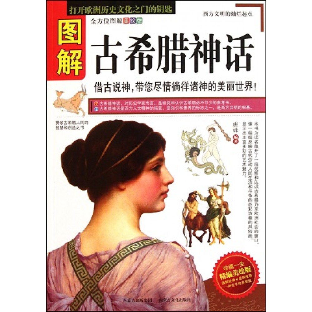 欧洲文明最早起源于希腊。“言必称希腊”,在世界文明史上,希腊以其独有的风格和魅力演绎出了一段最早的人类史。 古希腊神话起先是以诗歌的形式出现的,由古时候的希腊歌者吟唱,他们走街串巷,把美丽的歌曲从一个城市流传到另一个城市,歌颂希腊人民的智慧和创造。丰富的想象和精彩的故事情节让人们仿佛又回到了那个群岛环绕、陆海交错的爱琴海文明时期。它除了显示希腊民族的智慧以外,还显示了其在史学、美学和哲学方面的价值! 在天地初开的混沌时期,人类对大自然还不完全了解,所以他们就把一些不能解释的自然现象定义为神祗们的意旨。生活在古代的希腊人也是如此,他们认为人类最初的祖先是由神祗创造的,然后繁衍生息,慢慢地才发展壮大起来。而创造人类的这位神祗不仅统摄着天界、人间和地狱,而且掌管着过去、现在和未来,他就是全人类的祖先。随着历史的发展,古希腊人根据丰富多彩的社会生活,逐渐整理出一个神族谱系。他们认为这些神祗都是有生命活动的真实存在,而且犹如我们人一样,有男、女两性之分,不同的是他们拥有永久的生命。在神族谱系中,他们的身份、地位不同,则享受的威仪也不同。每一个神都有他们具体的任务,掌管不同的职责。他们虽然掌管着整个人类,可是他们也和人类一样,有感情、有不同的风俗习惯、需要衣食住行。只是他们让生命脱离了自然的束缚,饮用琼浆玉液来维持长生不老,正好符合人类幻想的最理想境况。 在古希腊神话中,他们把最高的山峰——奥林匹斯山作为众神居住生活的乐园,由天帝和天后的儿子、火神赫淮斯托斯为众神建造城堡和宫殿。等级较低的一些神祗则负责打扫,承担必要的家务劳动:有看管大门、喂养神马的时序女神;也有专门为众神斟倒琼浆玉液的青春女神;有传递信息的雨虹女神;为诸神唱歌助兴的掌管艺术的阿波罗和缪斯们;牧神潘也会在宴会上吹奏笛子助兴。 在希腊神话中神祗虽然能够预知过去和未来,可是他们并不是无所不能的。不同的神祗在权力和智慧面前的表现又不尽相同,他们所拥有的智慧和权利都有一定的局限性。如同人类一样,他们也会受到忧愁和苦恼的纠缠!在他们的意识中,已定的命运统治着世界的一切,是任何因素都无法改变的。 或许是因为神祗们都具有人类的喜怒哀乐,所以也有一些藐视神威的人类,可是他们的下场一般都是很惨的,无论如何努力,始终都逃不出命运女神的安排,不是被复仇女神追杀,就是被不和女神捉弄。 希腊神话故事可以说它是一个取之不尽的宝藏,有许多的美丽传说都源于此:被缚的普罗米修斯、潘多拉的魔盒、金苹果的故事、斯芬克斯之谜、特洛伊战争、七英雄远攻底比斯、九头蛇许德拉、阿波罗与月桂树等。在这些故事中我们可以得知:天父宙斯是最高统治者,他的命令神圣不可违背;先知者普罗米修斯就如同中国神话传说中的人类祖先女娲,捏泥造人;天后赫拉是一个美丽但是妒忌心很强的女神;智慧女神雅典娜人如其名充满智慧;太阳神阿波罗不仅长相俊美,而且还精通音律和预言:爱与美之神阿芙洛狄忒是希腊神祗中最美的女神,也是欧洲名画中出现最频繁的女神;大力神赫拉克勒斯的一生充满传奇色彩,死后竟然成为了神祗,他是希腊神话中唯一成为神祗的半人半神。还有许多扣人心弦的故事,希望读者能够慢慢阅读。