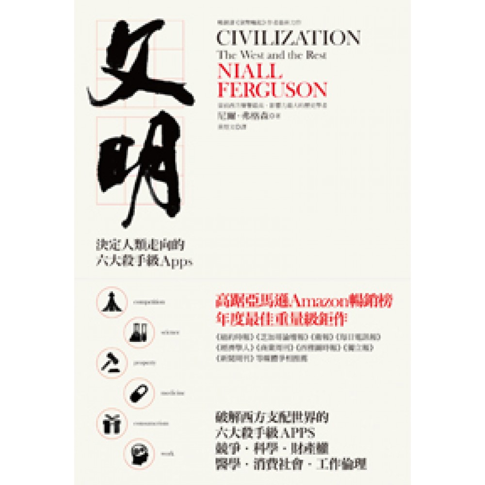 高踞亞馬遜Amazon暢銷榜 年度最佳重量級鉅作 《紐約時報》《芝加哥論壇報》《衛報》《每日電訊報》《經濟學人》 《商業周刊》《西雅圖時報》《獨立報》《新聞周刊》等媒體爭相推薦 當前西方聲譽最高、影響力最大的歷史學者、 《時代》周刊稱為「影響世界的100人」之一、 暢銷書《貨幣崛起》作者尼爾‧弗格森最新力作! 尼爾‧弗格森重新詮釋「東方文明與西方文明」的興起與衰落,更提出新的創見:破解西方如何支配世界的六大「殺手級應用」(Killer Apps)──競爭、科學、財產權、醫學、消費社會與工作倫理 《文明:決定人類走向的六大殺手級Apps》深入探討過去,大膽預測未來 西方何以支配現代世界超過500年? 西方的主宰地位是否正受到亞洲崛起的威脅? 過去,西方靠六大「殺手級應用」獲得壓倒性勝利。 現在,新興國家是否將藉著這六大利器,終結西方的優勢地位? 西方文明憑什麼統馭全世界? 十五世紀初,如果你能在當時環航世界,那麼最吸引你的將是東方的璀璨文明。明朝的北京正興建紫禁城;在近東,鄂圖曼土耳其人正進逼君士坦丁堡。 相較之下,英格蘭在你心中留下的印象卻是鼠疫、惡劣衛生條件與戰亂相尋的破敗景象。其他動輒啟釁的西歐王國,如亞拉岡、卡斯提爾、法國、葡萄牙與蘇格蘭,看起來也沒比英格蘭好多少。西方將在往後五百年間支配全世界,這樣的想法此刻看來無異是天方夜譚。然而,它居然成了事實。 西歐文明憑什麼勝過外表看來比它優越的眾多東方帝國?弗格森認為答案是西方發展出六大「殺手級應用」,而這六大利器正是世界其他地區所缺乏的:競爭、科學、財產權、醫學、消費社會與工作倫理。 時至今日,關鍵的問題是,西方是否喪失了對這六大利器的壟斷。若是如此,弗格森警告,我們將目睹西方優越地位的終結。 《文明》以深入淺出的文字,帶領讀者進行一場不尋常的環遊世界之旅。從中國的大運河到土耳其的托普卡皮宮;從南美洲的馬丘比丘到西非的鯊魚島;從布拉格的壯麗塔樓到溫州的祕密教堂。這是一則有關帆船、武器、地契、疫苗、牛仔褲與中文聖經的故事,也是一部清楚明晰的世界近代史。