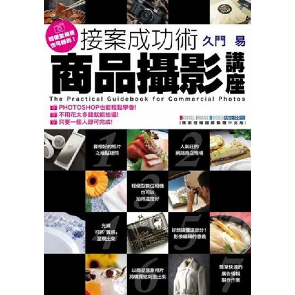 接案成功術--商品攝影講座 輕便型數位相機即可拍攝! PHOTOSHOP也能輕鬆學會! 不用花太多錢就能拍攝! 只要一個人即可完成! 「只要放上漂亮的相片,商品就會暢銷」的說法已過時了。 讓我們從各種角度以不矯揉做作的相片,有效率的將商品的特徵與用法表現出來!