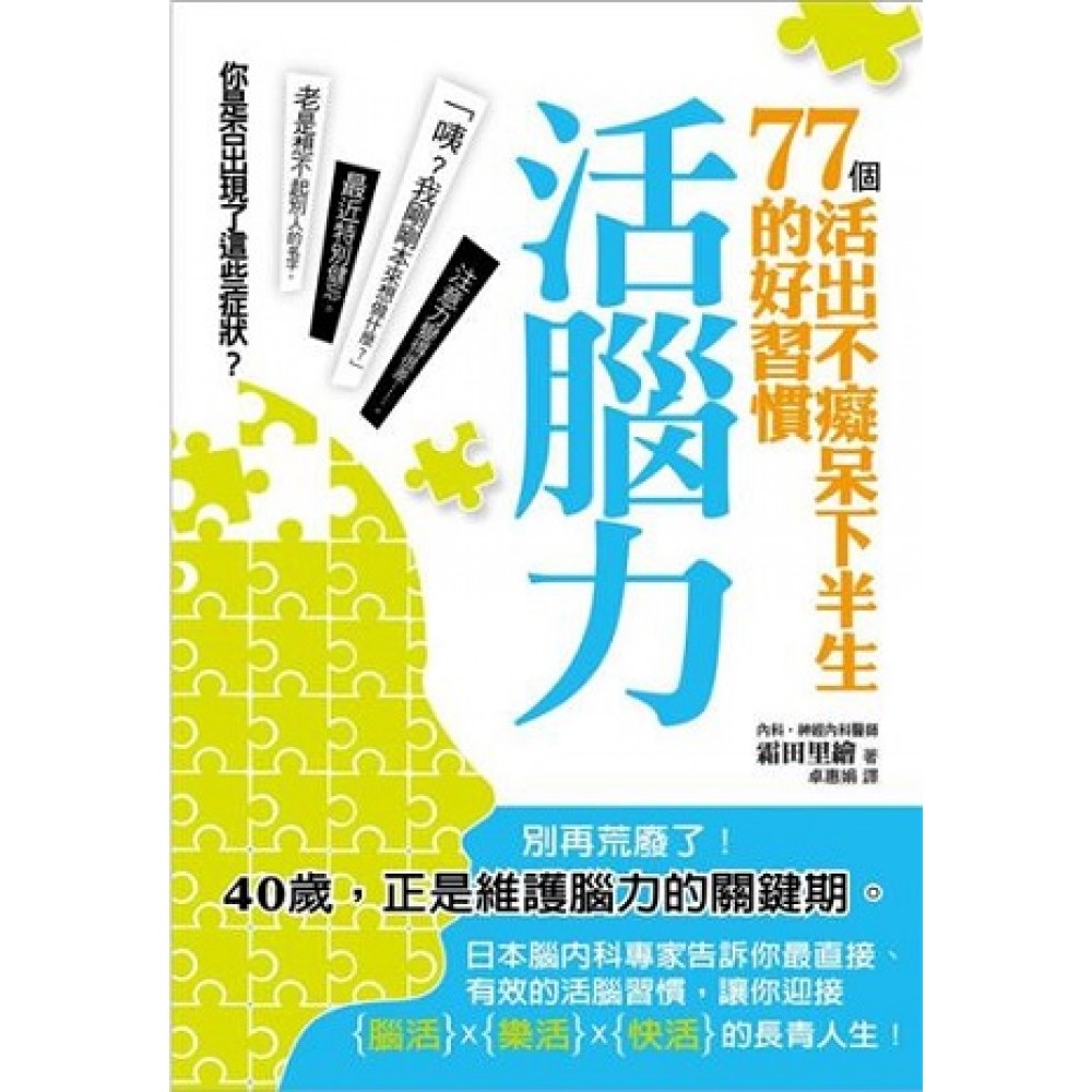 專業推薦!「我們常說『腦是身體的CEO(總裁)』,而且是一個秉持『用進廢退』原則的器官,也就是說:有用有進步,沒用會退步。但是要怎樣有效的『用進』,這就需要靠正確的知識。本書便是一本提供正確腦保健技巧資訊的好書!」 ──by 楊聰財醫師(楊聰才身心診所 院長、財團法人天主教耕莘醫院精神科主任級醫師) 「咦?我剛剛本來想做什麼?」最近似乎特別健忘。老是想不起別人的名字。注意力越來越差……。唉啊,這是大腦發出的警訊嗎? 「大腦從四十歲就開始老化了嗎?」「腦細胞會隨著年齡而減少?」很多人都有這樣的疑問,其實這種說法是大錯特錯,不論幾歲,大腦都會成長!反而是「生活習慣」使得大腦功能下降。日本腦科權威霜田里繪醫師提出活化腦力的77個好習慣,就從現在開始,有效掌握鍛鍊腦力的關鍵重點,激活你的腦力,遠離失智人生! 腦力VS.幸福人生,日本腦科權威這樣說: ■人際關係其實是「彼此的大腦吸引力」。 ■人生的幸福程度取決於「大腦思考的深度」。 ■與其感歎記憶及計算能力低落,不如「鍛鍊大腦多樣的能力」。 本書作者霜田里繪是位神經內科臨床醫師,每天的工作是治療和大腦及神經相關的不適或疾病。由於患者的人數一個月高達一千人左右,等於一年當中要面對一萬人以上的大腦。作者發現,病患中有許多是四十歲左右,很在意腦的功能下降的人。 這些在意腦的功能衰退而來醫院檢查的患者,他們主要的困擾,都是和過去相較之下記憶力變差、小小的失誤增加、注意力不集中等問題。患者認為「記憶和計算能力的衰退=腦功能下降」,希望設法挽回這些能力。 其實,大腦之中有很多功能,比記憶、計算等能力更重要,而且隨著年齡增加更能發揮優異功能。比方說,創造事物的能力、和周圍的人感同身受的能力等。活化大腦的這些功能,才是真正讓工作、私生活,以及所有人際關係變得更快樂、充實。 【40世代是活化腦力的關鍵期】 40歲之後的腦,亂搞就無法發揮效能!或許有人會認為:「可是,我一直都是這種生活模式,以前明明都沒問題……」沒錯,這就是重點。四十歲以後的大腦,如果亂搞就無法發揮它的效能。從40歲開始,每一天的保養都不可或缺。不是大腦功能下降,但是,已到了「疏忽休養、更新資訊,大腦就無法運作原本應有功能」的年紀了。 單純地牢記某事或計算能力,在十幾二十歲是巔峰期,然後就逐漸走下坡。不過,這些能力真有那麼重要嗎?邏輯、想像、創造力,以及感受、同感的能力,大腦還有其他各種力量,為了盡情享受每一天的生活、培育豐富的人際關係、活出更堅韌的人生,都取決於這些能力。 與其擔心計算能力遲緩,不如提升人生中的其他經驗,培養上述的能力更重要得多。這些體驗越多的人,不管到了幾歲,都能以豐富的感受力觀察事物,保持好奇心,以及對於他人的喜悅和悲傷感同身受。作者把這樣的大腦,稱作「活力腦」。而且,就是擁有活力腦的人,才能被許多人喜愛、信賴,開創心靈豐富的人生。 【讓大腦儲備更豐富的經驗吧!】成天只盯著電視、網路,只顧玩手機,腦袋裡塞滿不必要的情報,結果大腦沒有休息的時間、腦中的記憶僵化、沒有給大腦充分消化資訊的空閒。因此,要創造充滿活力的大腦,必須養成良好的生活習慣,讓大腦及身心都能隨時更新,使大腦擁有豐富經驗非常重要。 因此,如果說是要訣,首先就是「不要讓大腦感到膩」。大腦最討厭無聊無趣的事物。陷入公式化生活的人,容易罹患癡呆症。有時候必須選擇和平日不同的方法,讓大腦迴路獲得充分攪拌。 現在開始做,就會有效果:【使大腦更活潑的5要訣】 ◎重新養成良好的睡眠、飲食、運動習慣 如果生活習慣良好,腦的活動、新陳代謝也會順暢。 ◎不要讓大腦覺得無聊 沒有刺激,大腦就會鬆懈。盡力不要公式化非常重要。 ◎刻意運用大腦平時極少運用的部分 讓大腦發揮更廣泛的範圍,使其保持良好的平衡、更加活潑。 ◎一次使用大腦不同的部分 讓大腦運作於更高難度的作業,給予更多刺激。 ◎偶爾讓大腦放鬆 偶爾發發呆、讓大腦休息,才能使大腦保持活力。 檢測大腦靈活度,你有幾項符合呢? □記不得剛認識的人的名字。 □只要專注在某件事上面,很快就會筋疲力盡。 □挑戰新事物簡直難如登天。 □要顧慮到旁人的心情,說真的,覺得好麻煩。 □覺得自己的想法總是一成不變。 □常有身體失調、搖搖欲墜的感覺。 □覺得開心、幸福的機會變少了。 評分 ☑的數量 大腦活躍度 0 優秀!繼續保持現在的活力! 1~2 還不錯!只要稍加鍛鍊就能擁有活力腦喲! 3~5 持平。不加以注意的話,會開始走下坡,別忘了經常鍛鍊腦力喲! 6~7 走下坡狀態!要多多使用你的大腦,從現狀解套!