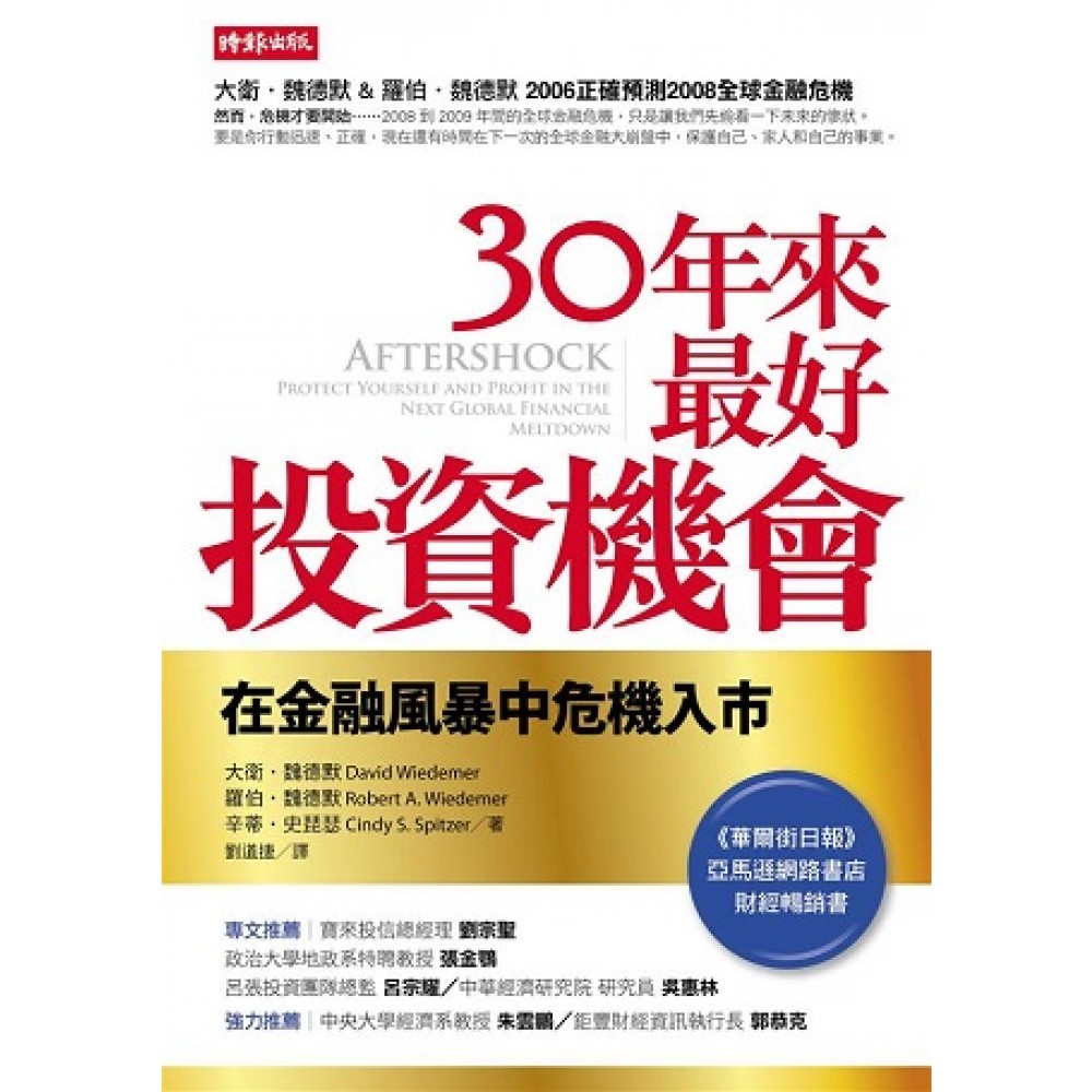 大衛.魏德默博士(David Wiedemer) 威斯康辛大學麥迪遜分校(University of Wisconsin-Madison)經濟學博士。全球首屈一指的總體經濟演變分析專家,他對資訊動力學、科技演變與經濟史的研究,構成《30年來最好投資機會》的預測基礎。現任絕對投資管理公司(Absolute Investment Management)首席經濟學家。 羅伯.魏德默(Robert A. Wiedemer) 威斯康辛大學麥迪遜分校MBA。現任絕對投資管理公司總經理,負責配合總體經濟分析與《30年來最好投資機會》一書觀點,從事總體性資金管理業務。 辛蒂.史琵瑟(Cindy Spitzer) 獲獎作家,從一九九三年起,一共和其他作家合寫二十多本傑作,包括《心靈雞湯》(Chicken Soup for the Soul)、《買進長抱已死》(Buy and Hold is Dead Again)、《美國泡沫經濟》(America's Bubble Economy)等書。她現任金融大地震顧問公司(Aftershock Consultants)總裁,根據《30年來最好投資機會》書中概念,針對個人、家庭與企業,提供協助支持與深入建議。