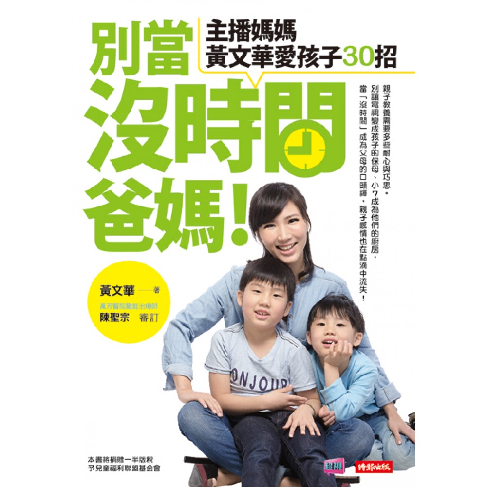 本書將捐贈一半版稅予「兒童福利聯盟基金會」 親子教養需要多些耐心與巧思。 別讓電視變成孩子的保母、小7成為他們的廚房, 當「沒時間」成為父母的口頭禪,親子感情也在點滴中流失! 怎樣愛孩子,永遠都在學,要與孩子更親密,就要好好花時間! 教養孩子 *觀察孩子的不同個性,用孩子能接受的方式管教! *孩子不能用騙的,說實話才能建立信任感 *孩子唱反調時,不一定是搗蛋,而是需要關懷與注意! 兼顧家庭 *讓長輩、親戚偶爾照顧孩子,家族更有凝聚力! *不要嫌親子旅行麻煩,旅途中還能訓練孩子獨立! *別把家庭日浪費在玩電腦、看手機,一起讀書、聽音樂,增加互動! 愛惜自己 *先生也要分擔家事,孩子更可適時幫忙,培養責任感! *偶爾與先生安排一段屬於兩人的浪漫假期吧! *培養自己的興趣,別把所有心力放在孩子身上!