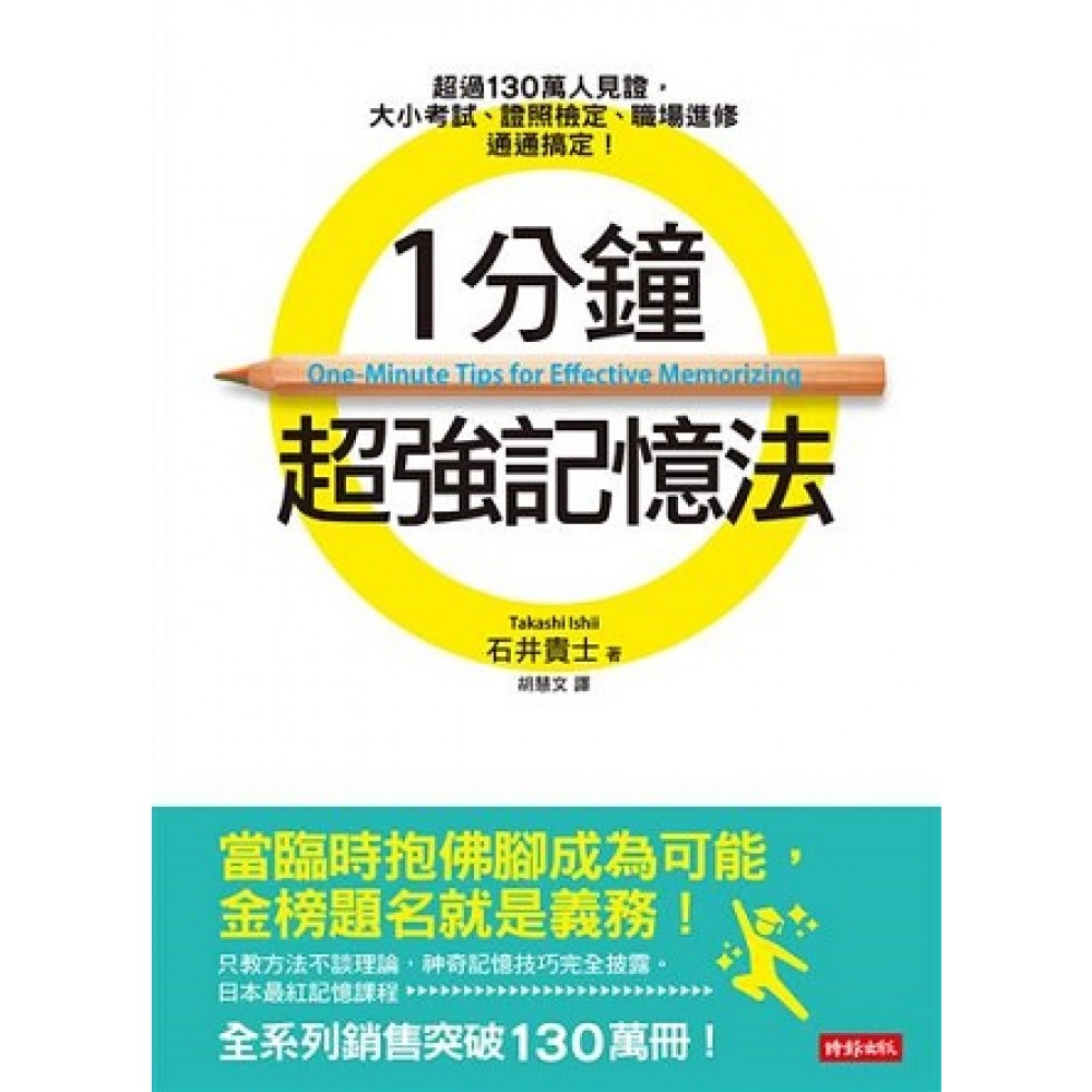 記憶天才私傳超強記憶法, 只教方法不談理論,神奇技巧完全披露。 日本最紅記憶課程,全系列銷售突破130萬冊! 你是否有以下的煩惱? 我頭腦不好,記都記不住。以為記住了,卻立刻忘得一乾二淨。 忙得不可開交,沒時間好好讀書。上考場就失常,無法發揮實力。 學校考試、資格檢定、學習英語、商業進修、腦力開發……資訊爆炸時代,你應付得來嗎? 你知道記憶的方式就只有四種嗎? →掌握短期、長期、單純、影像記憶等四種記憶技巧,就能永遠擺脫健忘的窘境。 你知道右腦擁有巨大記憶容量嗎? →善用人類右腦對顏色特殊反應的四色右腦記憶法,就能用最小的努力換取最大功效。 你知道記憶與維持記憶並不同嗎? →學會把短期記憶植入長期記憶的三明治記憶法,就能讓記憶長久存放在大腦中。 你知道臨時抱佛腳並不是神話嗎? →熟記上場前發揮最大潛力的峰值記憶法,就能用最短的時間獲得最不可思議的效果。 本書不分析大腦狀態,而是教你記憶方法。而且,效‧果‧驚‧人! 只要照著本書的記憶方式執行,就能養成迅速記憶能力, 幫助你全面提升理解力、注意力、記憶力,還幫助你迅速調整各種效率不彰的記憶習慣。 【1分鐘超強記憶法的特色】 ˙用眼睛目視就能記住,速度最快。 ˙一分鐘就能反覆背誦,效率最高。 ˙反覆背記深化為記憶,印象最深。 ˙利用四色彩刺激右腦,潛力最強。 ˙臨時登上考場也不怕,實力最好。