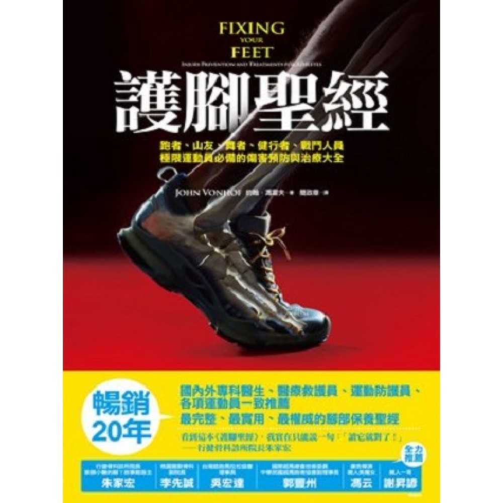 約翰.馮霍夫(John Vonhof) 是30年資深越野路跑與超馬跑者,曾跑過無數場50公里賽、50英里賽、百英里賽、24小時賽及72小時賽。他曾三度在超級艱難的美國西部百英里賽事中完賽,也曾背著30磅的背包,和隊友於8日內完成加州內華達山區的約翰謬爾步道。 1992年間轉換跑道,成為急診醫療輔助員,並取得骨科技術士、急診室技術士的資格,現為舊金山灣區緊急醫療服務機構一員,於全世界知名的路跑、超馬、登山或越野賽事當中,提供志願服務。2009年間,他參與了經典的運動傷害教科書Expedition and Wilderness Medicine之撰寫工作。 多年來,他在世界各地的賽事中擔任醫療志工,包紮傷腳,並訓練醫護站工作人員,也提供數以千計的運動員許多寶貴的護腳知識。 個人網站www.fixingyourfeet.com 提供各種運動員足部保養建議與教育。
