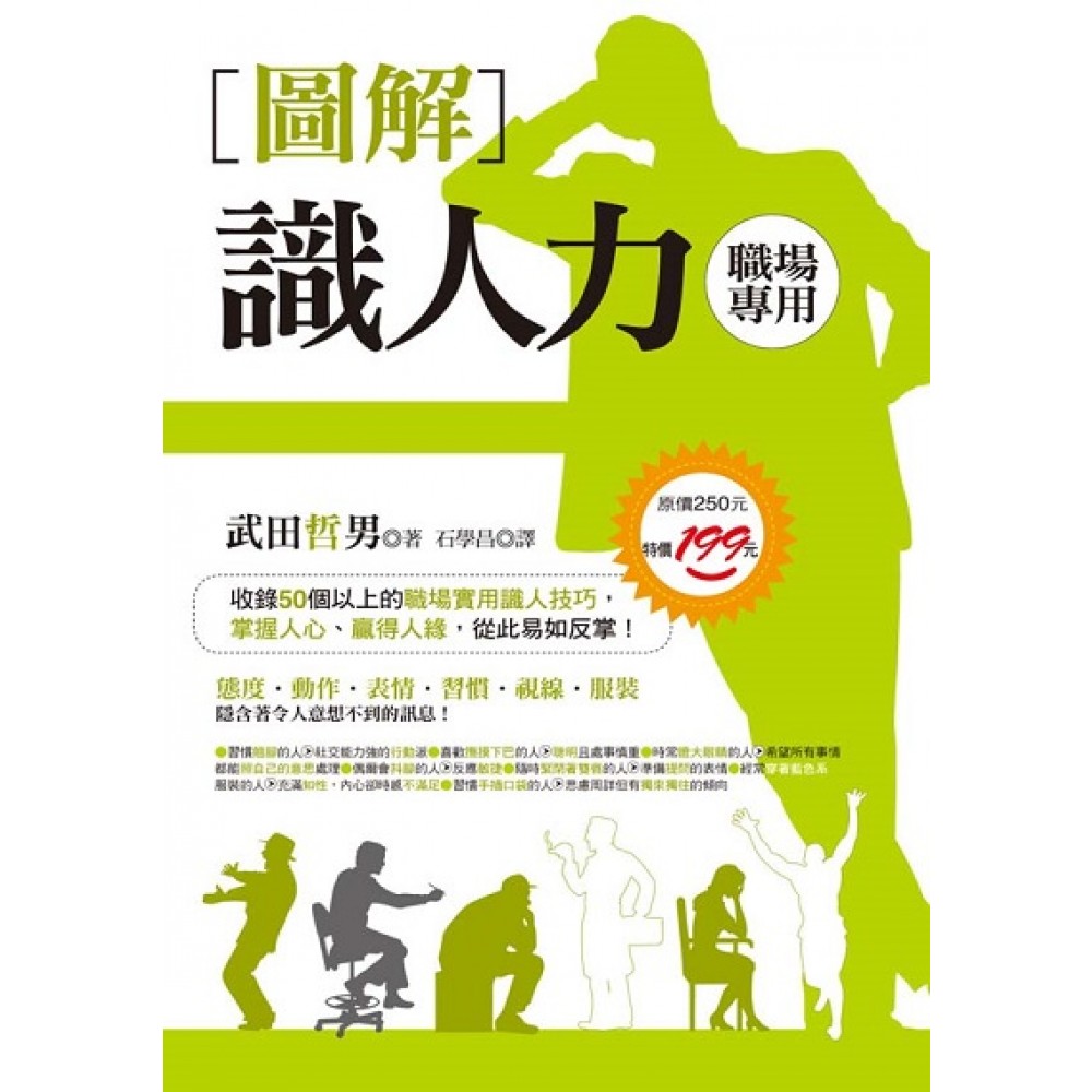 總是摸不清對方的想法,對社交關係戒慎恐懼嗎?時常被別人的言語眩惑,遭受欺瞞詐騙嗎?本書傳授你: ˙藉由第一印象、實際作為、記錄經驗、克雷奇默博士分類法、交流分析法、直覺、時間與金錢觀念、占卜及面相學、小動作等,透視人的真實個性。 ˙針對七大性格類型:能言善道型、忙忙碌碌型、魅力滿點型、嫉賢妒能型、紙上談兵型、自我實踐型、只受不施型,訂定和諧相處之道。 ˙從眼神、嘴型、聲音、表情、氣質、言談、手指動作、生活習慣、衣著色彩等,解讀性格特質與內心想法。總共50個以上的識人技巧,讓你輕鬆判讀各種動作所表露的訊息。想要為自己創造良好形象,也可藉由本書重新檢視自己的肢體語言,探究社交陷入困境的原因,成為八面玲瓏的人氣王!