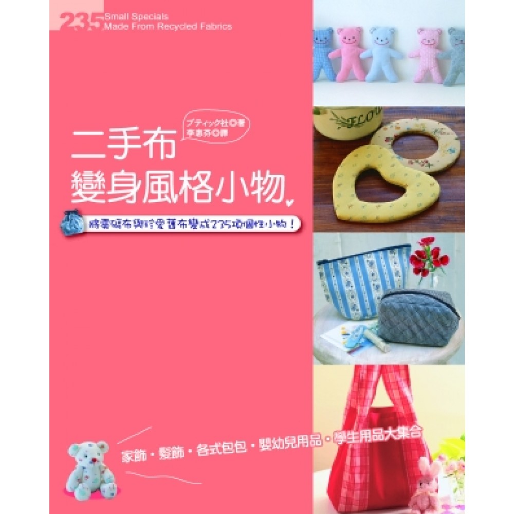 將零碼布與珍愛舊布變身成235項個性小物!家飾‧髮飾‧各式包包‧嬰幼兒用品‧學生用品大集合 本書教您利用零碼布、舊衣、牛仔褲、手帕與毛巾等二手布,做成235款生活小物,如:歐風廚飾、室內擺飾、束口袋、拼布包、文具、嬰兒用品、髮飾、胸針、抱枕、泰迪熊等,或將布貼於各種盒子上做成回收箱與收納箱。每項作品皆有完成照片、說明插圖,保證簡單易學,崇尚LOHAS主義的你一起來將二手布變成風格獨具的小物吧!