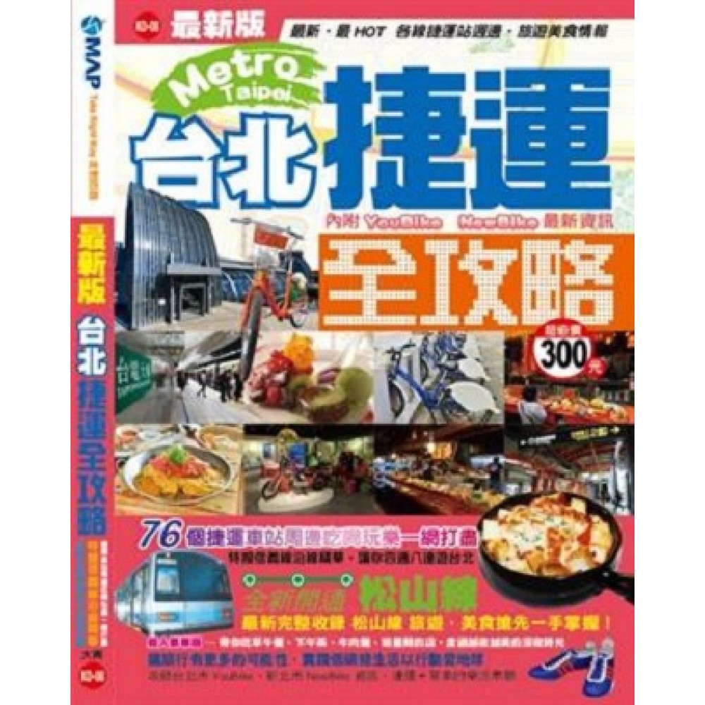 《台北捷運全攻略》 台北捷運全攻略 **捷運新開通-松山線** 76個捷運車站周邊吃喝玩樂一網打盡,特搜松山線沿線精華,讓你四通八達遊台北 詳細刊載捷運車站周邊地圖,景點對應方便按圖索驥 超人氣專題帶你吃早午餐、下午茶、牛肉麵、明星開的店,度過越夜越美的深夜時光 收錄(台北市YouBike、新北市NewBike) 資訊,捷運+單車的樂活串聯,讓旅行有更多的可能性,實踐低碳綠生活以行動愛地球