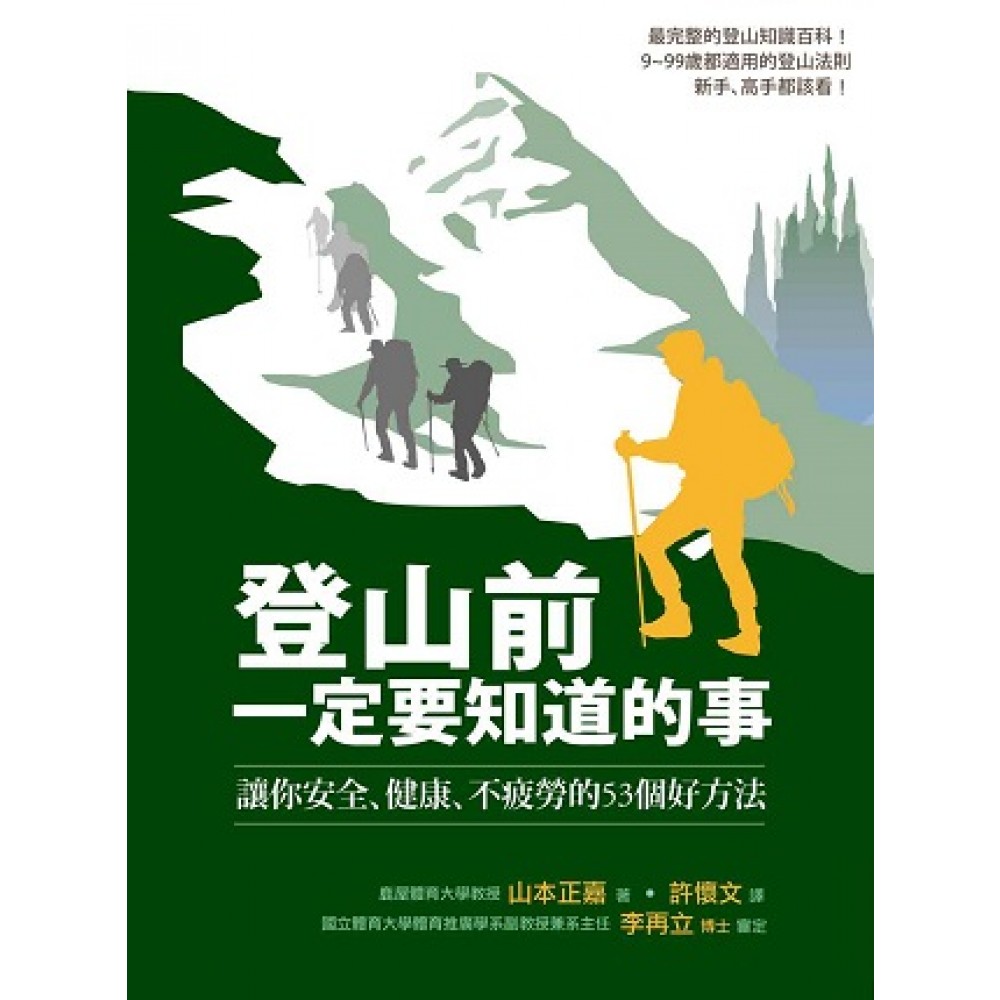 19個給登山新手的基礎概念 18個給經驗豐富登山好手的進階教學 16個登山常見問題及迷思解析 實用的身體狀況自我評量表 新手也能輕鬆看懂的詳細圖解 暢銷日本20年 最適合東方人體質實用登山寶典 登山體力=健康體力 登山是鍛鍊身體維持健康最好的運動! ※登山前不可不知五大要點※ ‧登山意外的發生,並不是肇因於年齡,而是因為準備不足。 ‧登山是有氧運動中,最適合全年齡層的步行運動 ‧一趟山中漫步所消耗的熱量>一次馬拉松>平地慢跑數小時 ‧長時間持續登山,可使膽固醇、動脈硬化指數、中性脂肪以及血壓都降低 ‧除了增進身體健康,登頂後精神上的滿足感,能為身心健康帶來極大的正面效果 本書由登山多年的專業作者,以三十年來實際的體驗及研究,帶給讀者最完整的登山知識和常識,讓你一看就懂!書中有超詳細的訓練圖解解說,幫助登山者作更完善的訓練,以及如何恢復疲勞、補充體力、增加能量,讓你安全健康的登山,享受登山帶來的無限樂趣! 19個給登山新手的基礎概念─ 鍛鍊登山所需的各項體能、適合不同族群的登山方式 18個給經驗豐富登山好手的進階教學─ 針對攀巖所進行的訓練、高地登山的各種方法及注意事項 16個登山常見問題及迷思解析─ 行進間禁止喝水?該怎麼補充養分才充足?在高地時怎樣的呼吸法最適合? 2個實用的身體狀況自我評量表─ 該休息了嗎?我現在適合出發嗎?