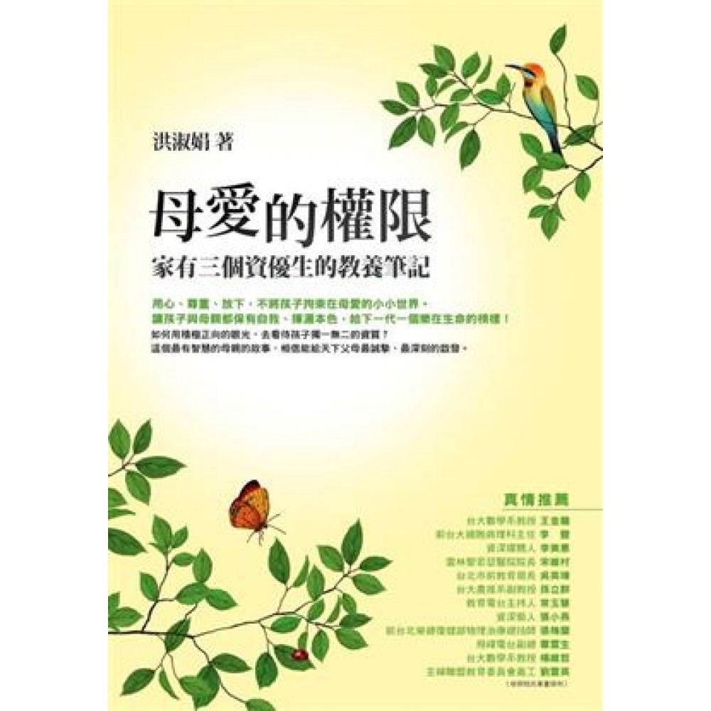 代序 媽媽辛苦了 許舒堯 推薦序 有甘有苦的成長智慧 王金龍 推薦序 教養的藝術 宋維村 推薦序 個性資優的母親 楊維哲 第一章 傾聽孩子的天賦 弄笨一個孩子很容易 一路跳級,措手不及 化解孩子的心靈危機 學校裡的福爾摩斯 母愛有限公司 讓媽媽去幫大野狼看牙齒 第二章 尊重生命的特質 就讓他去做白日夢吧! 不要搶當孩子的戀愛教練 自主性強的小大人 別忽略孩子的光芒 硬原則,軟決定 尊重他的成長 尊重孩子的學習自由 信任是親子關係的基礎 第三章 責任心的第一堂課 玩具的約定 賞罰該怎麼分明? 老三的震撼教育 別把孩子當貓熊養 讀書不是媽媽的事 第四章 當孩子的鏡子 武俠小說裡的品德課 身教勝於一切 You are what you say 學區當然很重要 居家教養的影響力 壞孩子是教出來的 有適應力才有免疫力 第五章 給教育正確的力量 不要做個寂寞的資優生 英文,讀就是了 學英文當然要趁早 每個禮拜的莎士比亞作文課 今天不要3+2=5好嗎? 打球去,不考試! 順性與順向 提升「六大力」 資優教育的養成 假資優與真績優 第六章 母親的勇氣與堅持 不尋常的出生過程 游泳與音樂的復健之路 假性單親媽媽們,加油! 承擔,類單親家庭 把淚水變成甘露水 後語 兩代女人的故事 歡喜相送阮阿媽 海口查某人 結語 跟我走上最精彩的旅程