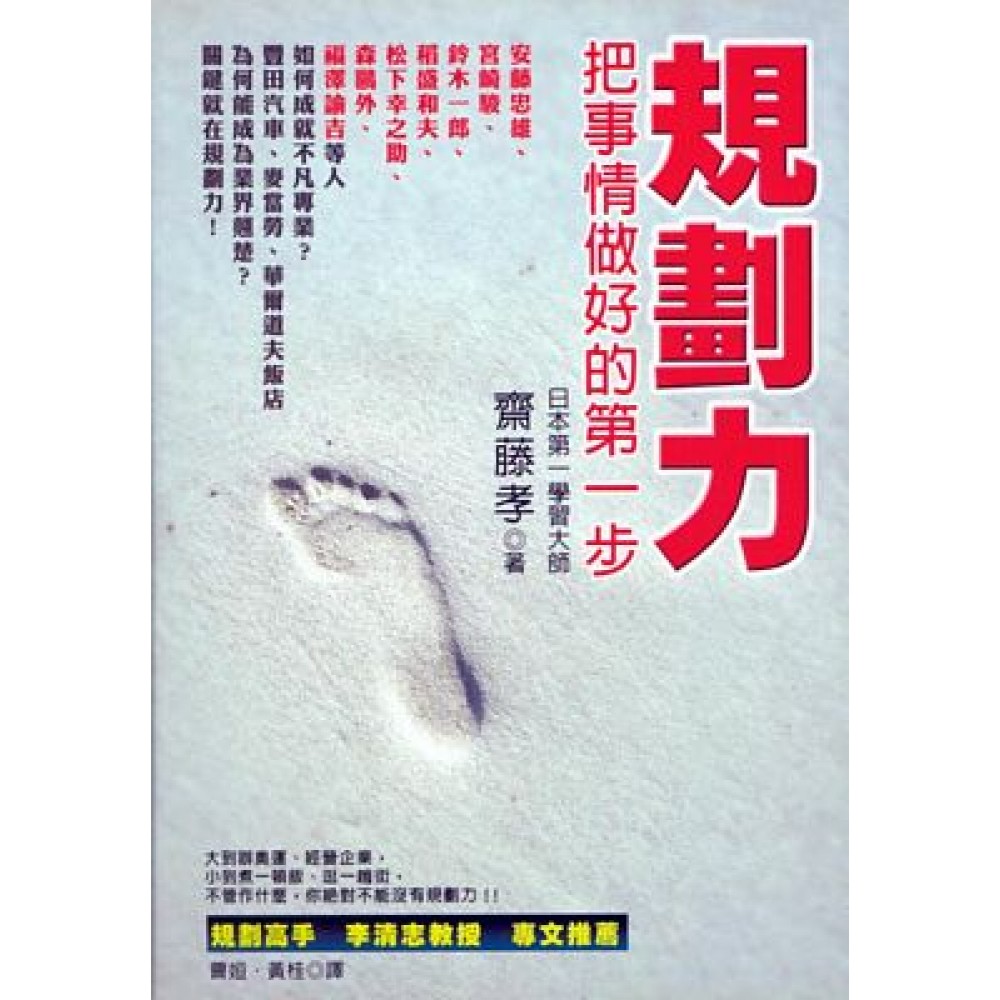 大到辦奧運、經營企業, 小到煮一頓飯、逛一趟街, 不管作什麼,你絕對不能沒有規劃力!! 日本第一學習大師教你立足社會的生存能力 安藤忠雄、宮崎駿、鈴木一郎、稻盛和夫、松下幸之助、森鷗外、福澤諭吉、莫札特、巴哈如何成就不凡專業? 豐田汽車、麥當勞、華爾道夫飯店為何能成為業界翹楚? 關鍵就在規劃力! 規劃高手 李清志教授 專文推薦 會做事的人就差在這一點 世界上除了天才和藝術家之外,大多數人的才華和能力並沒有很大的差別,唯一最大的不同只是規劃能力強的人和能力差的人而已。然而這種潛在的能力是可以鍛鍊改善的。本書宗旨便是要讓大家了解這種能力的重要性,透過觀念的建立及一些自我鍛鍊法,改善不好的做事方式,讓你的人生變得更有效率,協助你度過艱苦日子,迴避可能面對的人生危機。 【內容簡介】 本書針對「規劃力」的意義及獲得的方法作了論述,其實真正的目的是要讀者發現自己內在的「規劃力」。有許多例子顯示,有的人明明擁有「規劃力」卻毫無自覺。事實上,在我們的生活中小至做一頓飯或閱讀,大至構思建設案或是企業管理,處處都能也必須應用到規劃力。各行各業的人,舉凡作家、建築師、家庭主婦、學生、木匠、運動員、太空人……都有必要練就「規劃力」。規劃力可以提升工作效率、靈活應變能力,讓你更容易討生活、出人頭地。 齋藤孝的寫作風格非常活潑,並非教條式的講述這種冷硬話題,書中藉由許多有趣的故事和人物來闡述主題,讀者更可以從這些主角的經驗中深刻理解「為什麼必須具備這種能力,和具備這種能力的優勢」。 規劃力──把事情做好的第一步 會不會做事,就差在這一點! 擁有規劃力,能幫助你提升效率、避開危機,使人生更加快意順暢! 規劃力鍛鍊五步驟: 1. 什麼是規劃力?──做事之前先在腦中想好應該怎麼來進行,一步一步地讓作業更加順利流暢的能力。 2. 發現自我內在的規劃力──了解自己的做事方式是屬於井然有序型還是亂中有序型,找出適合自己的規劃力。 3. 取經高段規劃力的專家經驗──以透視規劃的角度仔細觀察各界專家和企業的作業流程,如豐田汽車的生產系統、建築大師安藤忠雄的組織創造力,藉以吸取經驗增長見識。 4. 從小規劃開始──拿起規劃力這把刀,按部就班地練習,就像初進飯店工作,先從打掃廁所開始,接著牢記客房相關事宜、熟悉櫃檯作業、資金調度、人事安排,最後終於成為飯店最高主管。 5. 將規劃力技術化──喚醒內在擁有的規劃力,以自己最擅長的型態工作,較能發揮自我能量,活力也將從中產生出來。