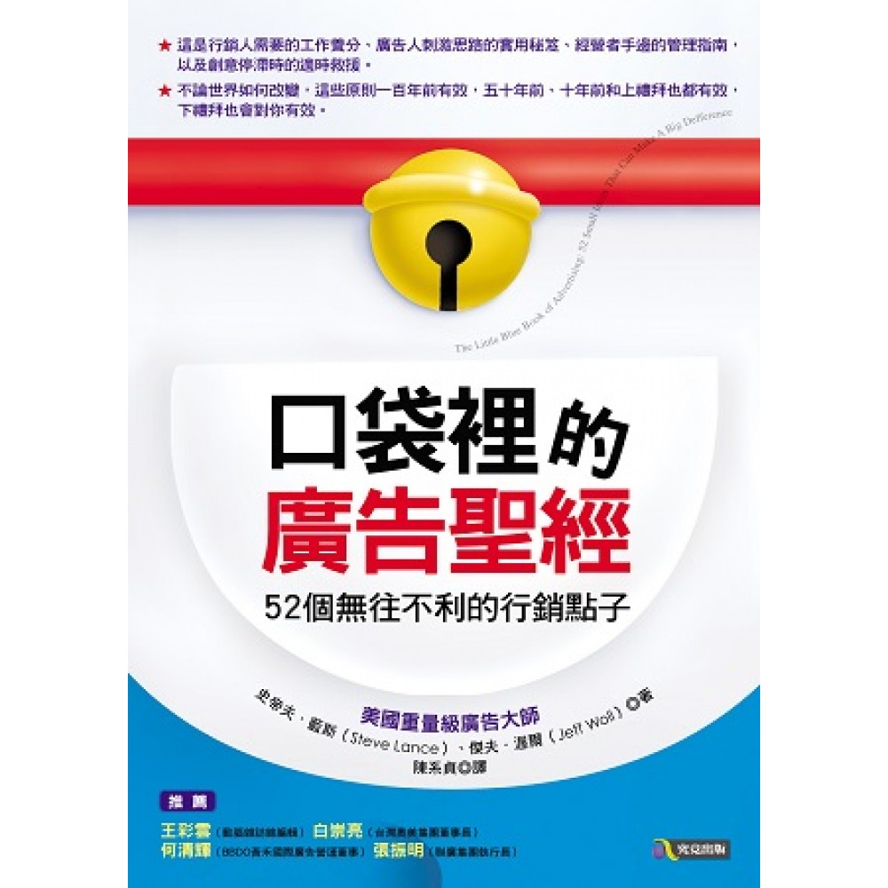 ★這是行銷人需要的工作養分、廣告人刺激思路的實用秘笈、經營者手邊的管理指南,以及創意停滯時的適時救援。 ★不論世界如何改變,這些原則一百年前有效,五十年前、十年前和上禮拜也都有效,下禮拜也會對你有效。 推薦 王彩雲(動腦雜誌總編輯)、白崇亮(台灣奧美集團董事長)、何清輝(BBDO黃禾國際廣告營運董事)、張振明(聯廣集團執行長) 書中處處告訴你:「為什麼你沒想到?」這是每個人必備的一本書。 ——廣告宗師Jerry Della Femina 「網際網路徹底改革了廣告!」 「電視媒體的天數已盡!」 「雜誌命在旦夕!」 「電台已死!」 拜託。為什麼不乾脆大喊:「天要塌下來了,天要塌下來了!」然後撒手不管? 我們見識過不景氣。 我們見識過無線電視之死,和有線電視的崛起。 我們見識過新的閱聽人和新的媒體來來去去。 而在這期間,我們也看到又好又有效的廣告,依舊不斷出現在市場上。 為什麼?因為市場上還是有人知道該怎麼做出有效的廣告。 前輩:不信試試 一本充滿無價大智慧的小書。 ——William E. Whitney,芝加哥奧美廣告公司前總裁 把本書塞進你的口袋,工作時大量查閱它,你會發現我們都用得到這本廣告小聖經裡的智慧。 ——Phil Dusenberry,紐約BBDO廣告公司前總裁兼首席創意長 每位廣告和行銷新人的桌上都應該要有一本。 ——Steve Miller,A. Eicoff & Company電視直效行銷公司資深副總裁 專家:不再是無頭蒼蠅 廣告叢林中既明快又有力的忠告──這是口袋版智慧。 ——Benjamin F. Jones,美國西北大學凱洛格管理學院教授 我希望所有商業書籍都能這麼深入淺出──此書無疑是一本廣告宣傳之必殺小抄。 ──Carol P. Osborne,美國南佛羅里達大學管理學院教授 行銷人絕對需要(不,救你一命)¬¬──本書價值如同黃金! ——Jane Maas,作家兼Earle Palmer Brown廣告公關公司名譽董事長
