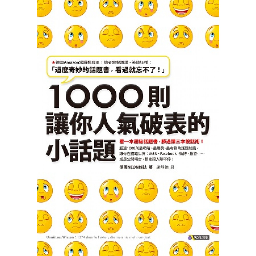 ★看一本超級話題書,勝過讀三本說話術!德國amazon常識類冠軍暢銷25萬冊,讀者齊聲說讚、笑談狂推:「這麼奇妙的話題書,看過就忘不了!」超過1000則最吸睛、最爆笑、最有聊的話題知識,讓你在網路世界:MSN、Facebook、微博、推特……或是公開場合,都能跟人聊不停! 內容介紹 1000多則「超沒用,but很有聊」的包山包海小知識 ‧「禁止在議會大樓中死亡」被票選為2007年英國最可笑的法律。 ‧在美國,於公開演出的場合中不得即興唱出<生日快樂>這首歌,因為時代華納公司在2030年之前都擁有這首歌的版權。 ‧布萊德‧彼特是歐巴馬的九等親侄兒,而安潔莉娜‧裘莉則是國務卿希拉蕊的九等親屬。 ‧手機這項發明早在1942年就已經登記了專利。 ‧豬的性高潮可以持續30分鐘之久喔~ ‧鬱金香的原產地在土耳其。 書中收錄上至宇宙自然萬事萬物的奧秘,下至茶於飯後嗑瓜子閒聊的名人奇聞軼事,不僅可增廣見聞,還能創造話題,營造愉快的人際氛圍。更奇妙的是,所有小話題,幾乎看過就忘不了,隨時隨地都能用!