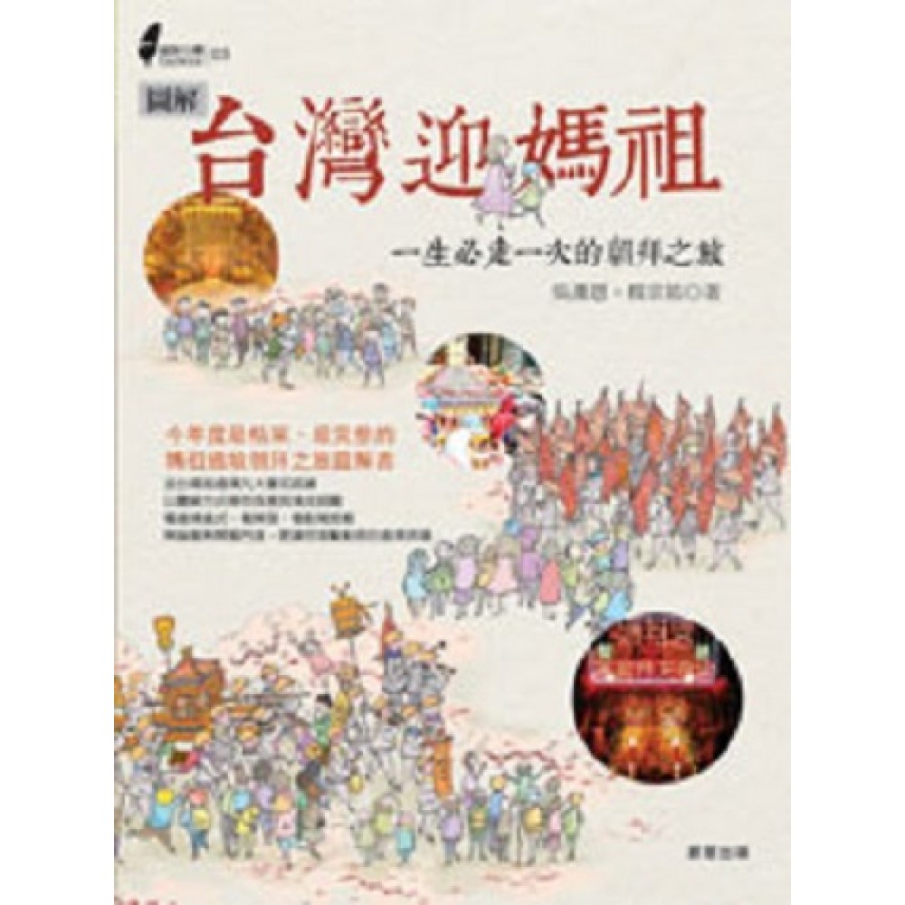 推薦序 自序一 自序二 [一覽就懂] 九天八夜大甲媽遶境示意圖 (手繪插圖搭配精采照片,以全知式的視覺觀點,穿插日夜行程,綜覽九天八夜的大甲媽繞境活動,讓讀者一覽就懂迎媽祖的所有行腳與過程) 導言:媽祖與媽祖信仰源流 介紹媽祖的故事、媽祖顯聖的傳說、媽祖歷代褒封、台灣媽祖信仰歷史淵源以及流傳、各地媽祖廟重要迎神活動等。 [北台灣] ◎北台灣迎媽祖活動大觀 ‧台北城迎媽祖 原清代官祀台北府天后宮「金面媽祖」等全國宮廟神尊,穿越北城門,重返台北城天后宮遺址。 重點介紹之廟宇,歷年(2004~2013)主辦及駐駕宮廟特色:臺灣省城隍廟、松山慈祐宮、臺北關渡宮、臺北天后宮、南港富南宮、三芝福成宮、古亭南福宮、竹北天后宮、基隆慶安宮、板橋慈惠宮等。 ‧蘆竹龍德宮迎媽祖 出巡八天,四百多公里。 重點介紹之廟宇:蘆竹龍德宮到麥寮拱範宮等,每次路線由開基四媽擲筊決定。 ◎其他迎媽祖活動 ‧苗栗白沙屯拱天宮迎媽祖 出巡遶境至北港,四百多公里。 重點介紹之廟宇:白沙屯拱天宮等。 [中台灣] ◎中台灣迎媽祖活動大觀 ‧大甲鎮瀾宮遶境進香 遶境中部台中、彰化、雲林、嘉義四縣,21鄉鎮市,近百座廟宇,三百多公里路。 重點介紹之廟宇:大甲鎮瀾宮、彰化南瑤宮、西螺福興宮、新港奉天宮、北斗奠安宮、彰化天后宮、清水朝興宮等。 ◎其他迎媽祖活動 ‧彰化縣媽祖遶境 重點介紹之廟宇:員林福寧宮、社頭天門宮、田中乾德宮、埤頭合興宮、二林仁和宮、芳苑普天宮、王功福海宮、鹿港台灣護聖宮、伸港福安宮、芬園寶藏寺等。 ‧北港迓媽祖 重點介紹之廟宇:北港朝天宮等。 [南台灣] ◎南台灣迎媽祖活動大觀 ‧府城迓媽祖 每三年一次的「府城迎媽祖」,齊聚台南古都各庄頭十大原香媽祖。 重點介紹之廟宇(四天遶境路線駐駕宮廟):安平開臺天后宮、鹿耳門天后宮、土城鹿耳門聖母廟、大竹林汾陽殿、西港玉勅慶安宮、鹽水護庇宮、善化慶安宮、安定後崛潭湄婆宮、下林玉聖宮、三郊鎮港海安宮、三郊營仔腳朝興宮溫陵廟、媽祖樓天后宮、開基天后祖廟、開基共善堂等。 延伸活動:府城媽祖文化節(媽祖迎壽華會)、府城媽祖行腳 ‧台江迎神祭 不定期,由鹿耳門天后宮主辦,最近兩次分別為2005年及2012年。 重點介紹之廟宇:鹿耳門天后宮之六大姊妹廟(西港慶安宮、大內石子瀨天后宮、安定許中營順天宮、安定蘇林村湄婆宮、善化茄菝天后宮、新寮鎮安宮)等。 ◎其他迎媽祖活動 ‧澎湖天后宮海上出巡 台灣極具特色的海上島嶼遶境進香活動 重點介紹之廟宇:澎湖天后宮等。