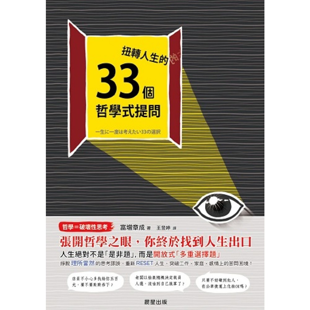 前言 人生就是不斷的選擇。 每個人都有自己的選擇方式。 而你,是依照什麼準則來做決定的呢?是習慣?環境?還是學校的教育?還是不知在何時所形成、屬於你個人風格的主義?還是順勢而為……? 不依任何憑據而做的選擇,會是「正確」的嗎? 若是做了別種選擇,人生或許會有所不同,也可能接下來就會改變。 活著,就一定得做出選擇。 但什麼也不做,也是一種選擇。 好好思考一下,你的人生到底是依據什麼而做出選擇? 這時,可以使用「哲學」這項工具。 你可能會認為, 「哲學?是那種說教式生活方式之類的嗎?聽起來好像很難啊。」 「哲學什麼的,感覺腦袋會變得更僵硬,不是會更難變通嗎?」 不是這樣的。 你心裡的記憶體,其實存滿了許多人的想法。 你以為是自己的想法,卻可能是父母親教給你的、友人的話語、從電視節目上聽來的、甚至有時,是掛在電車車廂裡廣告的標語。 不知從何時起,這些成為「思考之牆」,堅固地圈圍住你的腦袋。 所以,你必須要把這些存在你記憶體內的混亂資訊,先做一次格式化,回復到像是剛從工廠出貨時的狀態。 接著,在你的頭腦裡,築好思考的基礎。 之後,用自己的力量,選出你的選項。 這就是哲學的功用。 也就是說,把你現在所擁有的主觀意識全部破壞掉,創造新的思考。 本書將以三十三個選擇問題加上故事的方式,簡明易懂地介紹能夠軟化僵硬的頭腦、更自由思考的方法。 其中也包含了一些猛然一看,感覺沒什麼價值的問題。 但是,在那裡即矗立著思考之牆。 愈是不需多加思索即可做出選擇的事情,就愈有必要探究一次其理由為何。 故事的主角佐藤,是個沒有自己主見的人。但是在某個機緣下,他接觸到了哲學,並且開始一點一點地讓自己的思考格式化,也能接受對新事物的理解方式。 看完這三十三個選擇後,你應該也能學會以各種角度去看待事物的思考方法吧? 如果是商務人士的話,會發現,自己過去可能看過的「自我啟發」之類的書籍,其實早就存在於過去兩千五百年的哲學之中。 了解哲學之後,再進行自我啟發,就更能實踐人生哲學。 「最近,愈來愈搞不清楚自己到底是為什麼才要學習和工作。」 「以前還會有躍躍欲試感,現在完全提不起勁。」 「我開始覺得自己的人生己經到了極限了。」 「年紀愈大,未來好像也不會再有什麼有趣的事了。」 「每天被時間追著跑,一直都覺得時間不夠用。」 「人際關係也處理的不好,老是覺得火大。」 「做什麼都無法持續,己經不想再學習什麼了。」 陷在這種情緒中的你! 這就是碰撞到思考之牆的危險狀態。你以為是自己的思考,但其實並不然。 這是被外在力量牽引而選擇的人生。 很討厭是吧? 馬上就格式化、輸入更有力的思考法吧。 帶著自信所做的選擇,絕對不會後悔的。 找回自我,創造自己的未來吧! 就由本書來幫助你 那麼,就從破壞思考開始。發射創造未來的火箭吧!