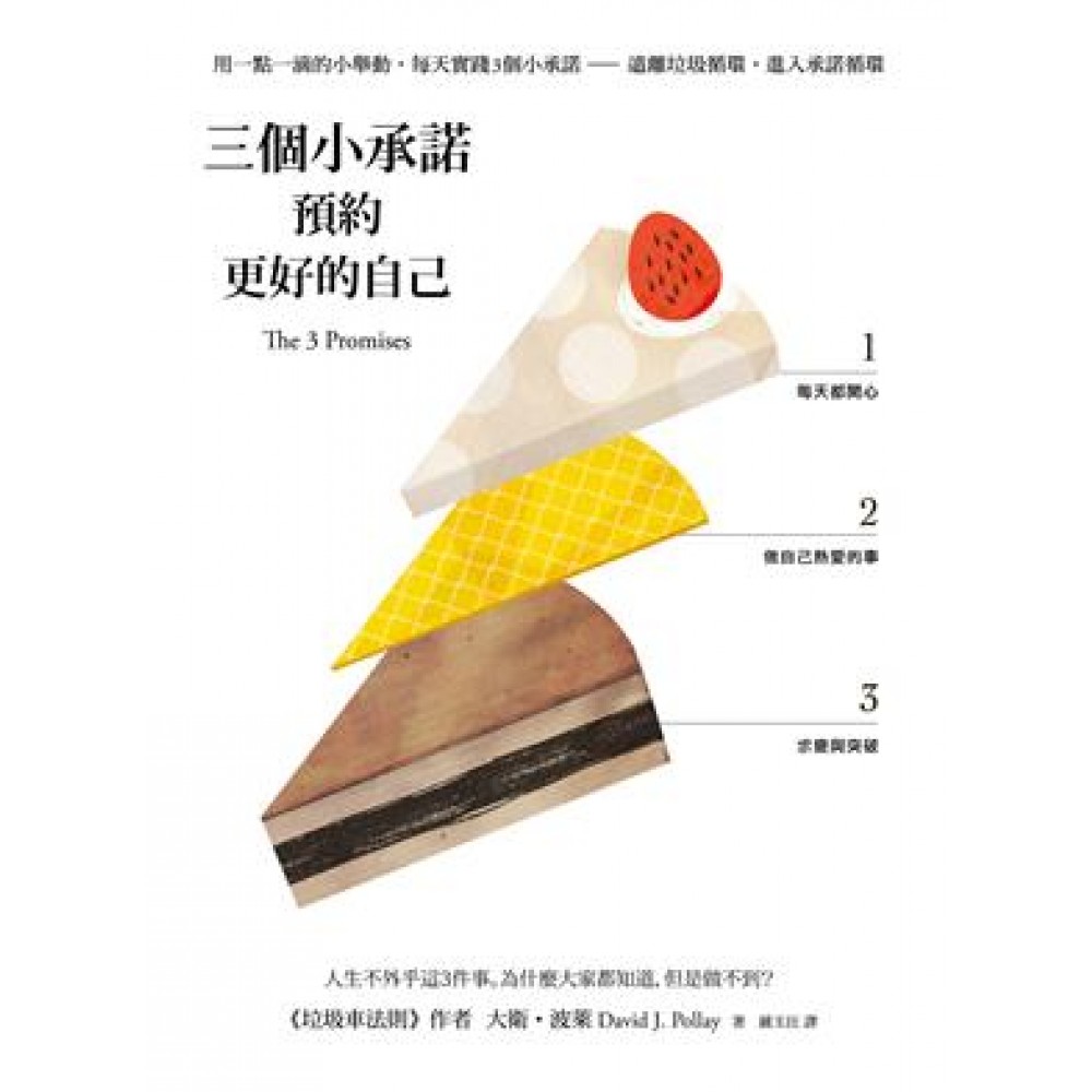 {1 每天都開心 2 做自己熱愛的事 3 求變與突破} 人生不外乎這3件事。為什麼大家都知道,但是做不到? ◆300萬人熱烈共鳴的《垃圾車法則》作者大衛‧波萊,開出全新生活處方箋。 ◆從書中的52個小舉動/小故事開始,把三個小承諾融入生活中,每一天都煥然一新。 ◆每一章結尾都有具體的「行動方案」,幫你輕鬆實踐三個小承諾。 ◆「向垃圾車說不」之後,不用再追著垃圾車跑,也不用費力躲避垃圾車。只需循序漸進,從小地方著手,打開你的快樂開關! 大衛‧波萊在《垃圾車法則》這本國際暢銷書,教導我們如何轉化負面情緒,以免遠離目標,落得與壓力或不幸為伍。在新作《三個小承諾,預約更好的自己》,波萊力主每天履行與自己的三個小承諾,讓日子充滿樂趣,對工作滿意,還能發揮影響力改變他人的人生。 1 每天都開心 2 做自己熱愛的事 3 求變與突破 多年來,波萊在全球一百多個國家向知名企業與人士推廣正向心理學,發現一個簡單卻放諸四海皆準的真理──每天投入充實的活動,正是讓自己開心的不二法門。 波萊提出一些策略,簡化轉型的練習與行動,協助大家履行承諾,活出充實的人生,方法包括: ‧善用「正向開關」與日常例行儀式,呈現自我最好的一面。 ‧以積極的態度及建設性的角度敘述自己的人生。 ‧根據「線索」找到自己熱愛又充實的工作與生涯。 ‧掙脫「他人會怎麼想」的陷阱。 ‧從事更多你熱愛的活動,但無須辭職。 ‧放棄「益智節目搶答的心態」,無須老是炫耀自己的知識,或老是覺得自己是對的。 ‧勿在意他人無傷大雅的冒犯──學會原諒。 ‧大方對他人付出,家庭與職場會因為你的付出而有所改變與突破。 全球有數千人加入波萊三天三個小承諾的挑戰,提高個人與工作上的成就感,你也趕快加入吧。僅需三天,你會發現充實的生活讓人平靜又有活力。