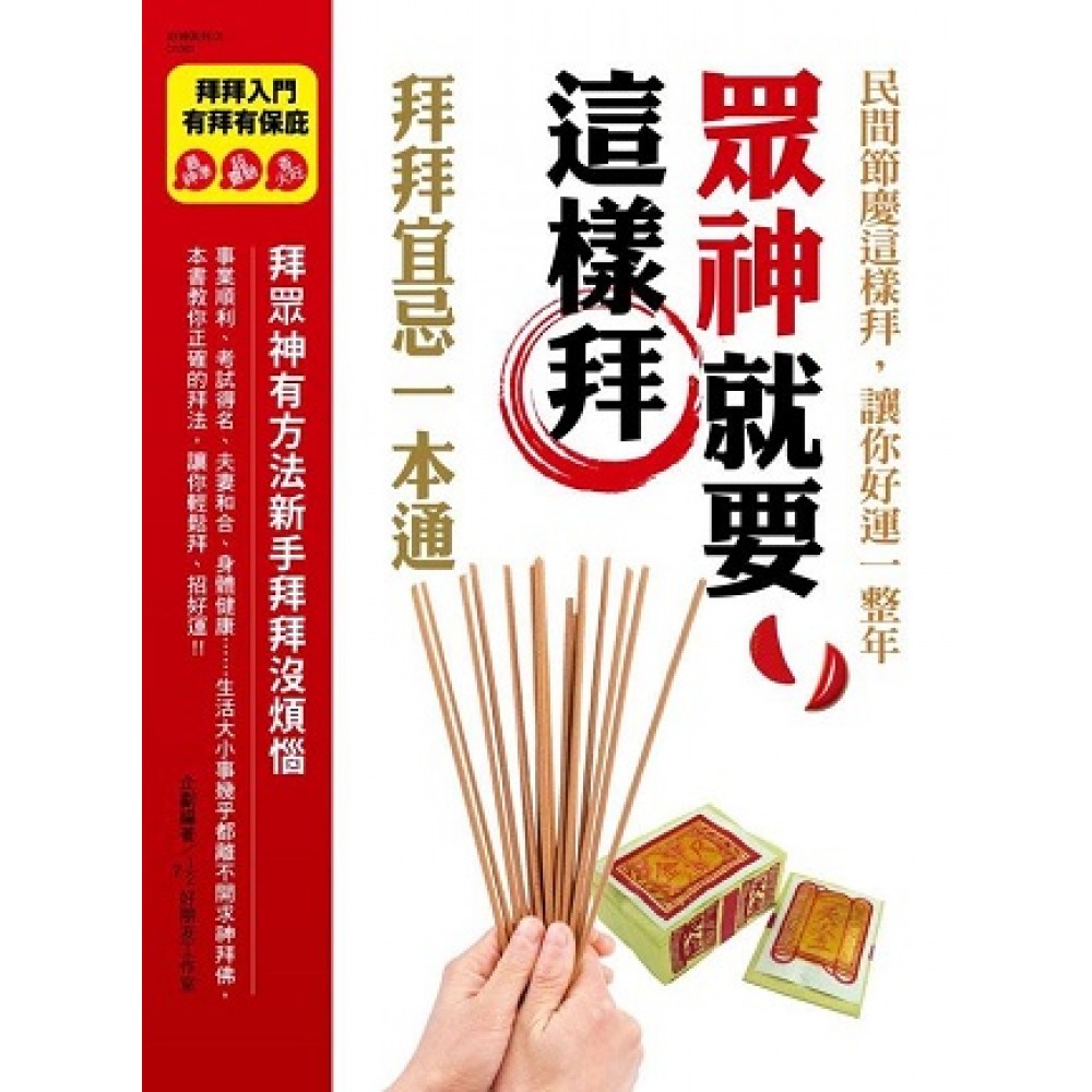 民間節慶這樣拜,讓你好運一整年!! 祈求神明、祖先保佑、子孫安康……有拜有保庇 上香,是向神明表示敬意以及傳達心願的一種儀式。藉由焚香上升的煙霧,將我們想要傳達的事情帶給天上的神明,是與神明溝通最普遍的方式。一、 永保福氣安康的拜拜小常識:詳述居家拜神宜忌、拜拜金紙種類、擲筊與上香的方式、祭拜水果宜忌等拜拜相關常識。二、 祈運招財,寺廟拜拜:介紹神明的由來和民間流傳的習俗,對於什麼時候該拜拜、拜拜該準備什麼樣的供品、金紙,供品該如何擺,也都有詳細的圖說。三、 民間節慶:介紹民間各種節慶的由來及典故,什麼節日該拜什麼神明,又該準備哪些供品和金紙,都有完整的說明。事業順利、考試得名、夫妻和合、身體健康……生活大小事幾乎都離不開求神拜佛,本書教你正確的拜法,讓你輕鬆拜、招好運!!