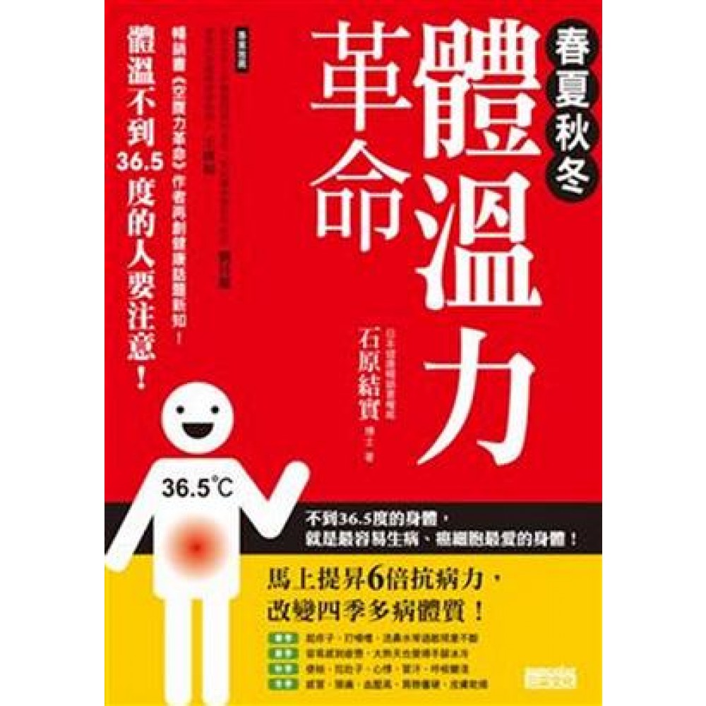 暢銷書《空腹力革命》作者石原結實再創健康話題新知! 不到36.5度的身體,就是最容易生病、癌細胞最愛的身體! 改變四季多病體質、提昇6倍抗病力,就要靠體溫力! 你是不是也是這種人? 寒冷的冬天總是隨便沖沖澡了事?夏天時總愛喝冰茶、吹冷氣? 這些習慣,讓現代人的身體,幾乎一年到頭都處於低體溫中,並且四季都會以各種不同形式出現不適症狀! 【春季】起疹子、打噴嚏、流鼻水等過敏現象不斷 【夏季】容易感到疲憊,大熱天也覺得手腳冰冷 【秋季】便祕、拉肚子、心悸、冒汗、呼吸變淺 【冬季】感冒、頭痛、血壓高、肩膀僵硬、皮膚乾燥 什麼叫「低體溫」?就是指體溫不到36.5度的人! 如果長期忽視低體溫問題,將可能對健康產生多大的危害? 身體冷冰冰,將容易導致經痛、不孕! 新陳代謝力低,比正常體溫的人容易胖12%! 特別容易疲憊及感冒,罹癌機率也比常人高! 在流感病毒、致癌因子肆虐的現代,最能保護自己的只有身體的免疫力! 百萬冊暢銷書醫學博士 ~ 石原結實將告訴你:「體寒為萬病之源」,只要甩掉冷體質,就能立即提昇6倍抗病力! 《春夏秋冬體溫力革命》將為你帶來一整年的健康! □血壓下降了,連膽固醇也降低了! □肥胖再見!再也不用擔心體重計上的數字! □只要知道本書的預防法,就能增強抗病力! □頭腦更清晰、變得更積極......身心的健康也一併擁有了! □神經痛、感冒......每年都來煩你的身體毛病,今年起將可以安心! 本書特色 1.暢銷書《空腹力革命》作者石原博士再創健康話題新知! 2.不到36.5度的身體,就是最容易生病、癌細胞最愛的身體! 3.如果一年到頭都處於低體溫中,春夏秋冬都會以各種不同形式出現不適症狀! 4.長期忽視低體溫問題,經痛、不孕、肥胖甚至是癌症,將可能找上你! 5.馬上實踐石原式超簡易養生法,提昇6倍抗病力,改變四季多病體質!