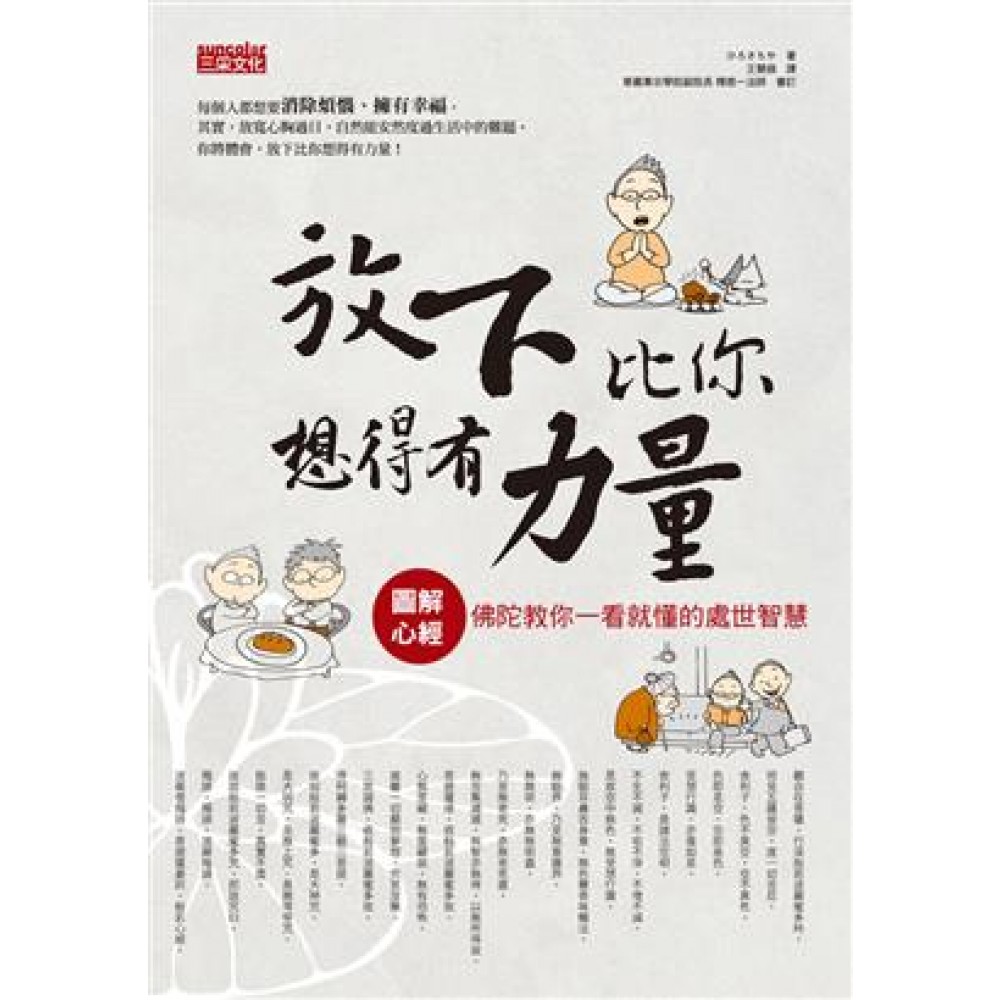 Part 1 《般若心經》能解決煩憂,教導真理 ◎二百六十二個字,消除所有煩惱 只要懂得第一行,即可瞭解《般若心經》 就《般若心經》中反覆說明的「空」來加以思考 「空」,就是沒有執著地看待事物 【專欄】觀音菩薩是自由自在看待事物的超凡之人 撕下心中的標籤,即可看見「空」的世界 只要修行,人人都可理解「空」為何物 苦行無法悟得「空」為何物,應從不計得失的日常生活中體悟 即使無法完全捨棄得失心,仍應盡可能不計較得失地活著 【專欄】在大乘佛教裡,人人皆平等擁有瞭解真理的機會 朝著目標,採取進一步、退兩步的速度前進 愚者一次就說:「懂了」 只要瞭解到能理解的程度即可 Part 1 總結 【煩惱諮商室】我好孤獨,活得沒有意義! *般若心經大解惑 玄奘、鳩摩羅什……三藏法師其實有好多位? Part 2 實踐不計得失的教義 ◎不是指一般的「聰明才智」,而是擁有佛教的「智慧」 想要活得無煩無憂,必須實踐「三項智慧」 【專欄】有如車子雙輪般的「六波羅蜜」,才是智慧的實踐 ■吃虧的智慧 想要有所「失」,就必須先有所「施」 付出時別覺得對方可憐,而應心懷「感謝」之意 即使沒有真正付出,只要抱持「付出的心意」即可 若不知如何是好,不必多想直接起身離開 只要有吃虧的心意,便能遵守道德及法規 蟑螂雖然有其存在價值,但忍耐也有限度 認同脆弱,容許他人的軟弱 不費盡心力去擁有一切 ■不解決問題的智慧 不管是翹課或翹班,先不解決問題、將其擱一邊 不要勉強上學或上班,一旦放下便能看見本質 痛苦時,誦念「南無阿彌陀佛,阿彌陀佛」 死是人生的一大功課,沒必要刻意延長生命 煩惱永遠不可能消失,與煩惱和平共處能輕鬆快樂 ■不強求世界變得更美好的智慧 因為有了比較心,世界才有好壞之分 不必設法解決霸凌,而是站在被霸凌者同一邊 如果兩兄弟面前,只有一個麵包的話? 放棄所有權,供奉給佛陀 ■利用三項智慧揮別一切煩憂 不計得失的生活態度,能正確看清事物本質 丈夫、兒子、弟弟都被判死刑,該就哪一個? 口號就是隨興自在、豁然開朗、不汲汲營營 「隨興自在」地選擇,「豁然開朗」後改變看法 不要焦急,快樂地以「不汲汲營營」為目標 人生就像一場戲,人人都是劇中人,就算有病人、壞人也無妨…112 一旦瞭解自己也是「空」,煩惱便能盡消 Part 2 總結 【煩惱諮商室】我想阻止女兒的婚外情 *般若心經大解惑 最聰明的舍利子是釋迦牟尼佛的十大弟子之一,為何他總是被說教? Part 3 用現在的語言,重讀《般若心經》 佛說摩訶般若波羅蜜多心經 觀自在菩薩。行深般若波羅蜜多時。照見五蘊皆空。度一切苦厄。 舍利子。色不異空。空不異色。 色即是空。空即是色。受想行識。亦復如是。 舍利子。是諸法空相。不生不滅。不垢不淨。不增不減。 是故空中無色。無受想行識。無眼耳鼻舌身意。無色聲香味觸法。 無眼界。乃至無意識界。無無明。亦無無明盡。 乃至無老死。亦無老死盡。無苦集滅道。無智亦無得。以無所得故。 菩提薩埵。依般若波羅蜜多故。 心無罣礙。無罣礙故。無有恐怖。 遠離一切顛倒夢想。究竟涅槃。 三世諸佛。依般若波羅蜜多故。 得阿耨多羅三藐三菩提。 故知般若波羅蜜多。是大神咒。 是大明咒。是無上咒。是無等等咒。 能除一切苦。真實不虛。故說般若波羅蜜多咒。 即說咒曰。羯諦。羯諦。波羅羯諦。 波羅僧羯諦。菩提薩婆訶。般若心經。 *般若心經大解惑 為何《般若心經》會在日本如此廣泛地流傳呢? 終曲