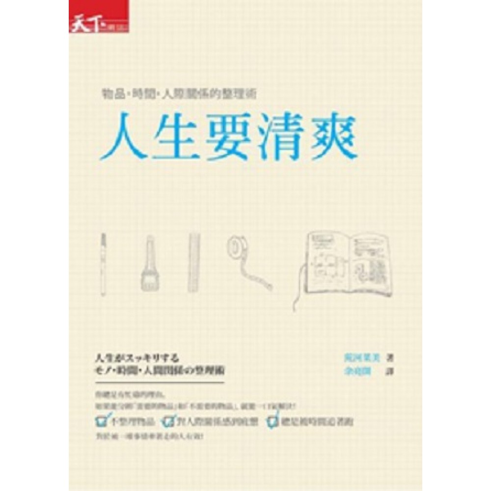 推薦序 《有效的清理,讓人生清爽順暢》 廖輝英 推薦序 《多酷的人生》 陳若玲 推薦序 《讓人生更清爽:物品、時間、人際關係整理術》 林佩玲 前言 第1章 整理物品 為什麼 整理物品是必需的呢? 判斷該放手物品的基本規則 1. 物品愈少愈能善加運用 2. 辦公桌是反映你行動的鏡子 3. 收納道具太多而使物品變多 4. 用「便利貼魔術」分辨使用與不使用的物品 5. 什麼都行,養成每日放手一樣東西的習慣 6. 「困惑袋」:為了因煩惱而停止整理的人 7. 如果能意識到動線,物品就能有條理 8. 如果能戒掉固執想法,物品就會完全轉變 9. 愈珍藏的物品,事實上愈沒什麼用處 10. 如果知道自己所關心的事,就能聚焦於需要的物品 11. 為怎樣都不能丟的物品尋求「替代物」 12. 使效能逐漸提升的「三分之一法則」 第2章 整理時間 為什麼 整理時間是必需的呢? 判斷該放手時間的基本規則 1. 把一天分做24節來思考 2. 事先決定「與人會面的日子」 3. 不在上午進行會議 4. 空檔時間決定能否靈活運用時間 5. 研究「工作×時段」的組合 6. 將星期三做為預備日,可以防止計畫崩解 7. 利用「時間區分袋」,將自己從找東西和忘東西中解放出來 8. 將瑣碎的事情化零為整 9. 己所不欲勿施於人 10. 星期五更要早睡 第3章 整理人際關係 為什麼 整理人際關係是必須的呢? 判斷該放手人際關係的基本規則 1. 人際關係需要「剪枝」 2. 讓「目的」與「人」相吻合 3. 決定交往的頻率 4. 明確區分「商務」與「友人」 5. 跨業種的派對只會留下大量的名片 6. 試著獨處 7. 善於邀約能使人際關係得以復甦 8. 人不會想要與無法帶給自己利益的人會面 9. 一收到郵件,盡可能先回覆 10. 意識人際關係中的「順序」 結語