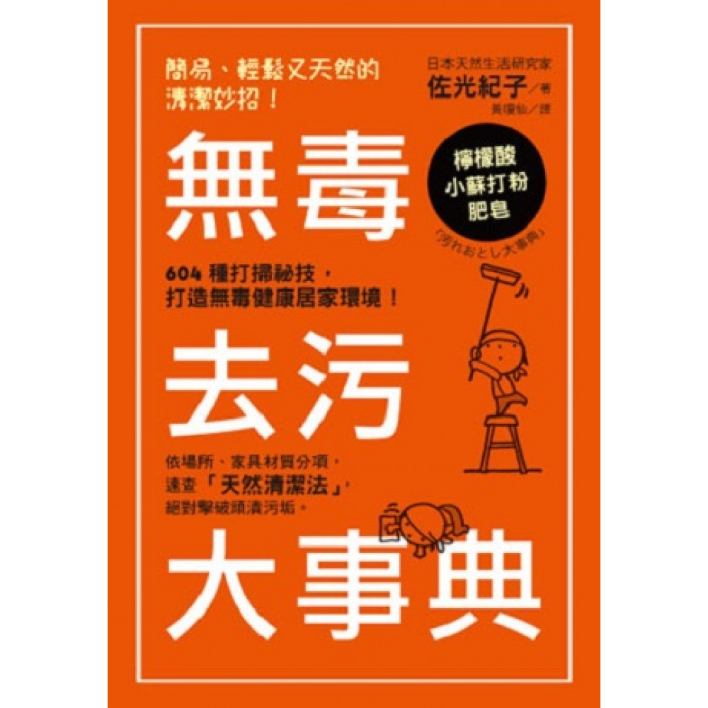 日本AMAZON網站★★★★★星推薦!全方位打掃大百科! 收錄604則清潔方法,史上最強去污大事典 有毒清潔劑,OUT!強力去漬劑,滾開!臭臭漂白水,BYE! 對付任何頑漬污垢,不需用「還我漂漂拳」,只要三大法寶── 肥皂、檸檬酸與小蘇打! 以天然小物打掃,家具也能亮白如新; 避開清潔劑的化學氣味與有毒物質,不但空氣清新,更能迎接健康好環境。 遇上棘手污漬不要緊,速查速找,方便到讓妳大吃一驚! 照著書上步驟動手洗,簡單到不行,再頑劣的污垢都能輕鬆打趴! ★針對家中不同場所、家具不同材質、污垢的酸鹼,速查掃除方法! 本書展出604招清潔方法,全部用免錢又省力,打造乾乾淨淨的居家環境──拆解馬桶各部位,step by step教你左刷刷右擦擦:馬桶外蓋怎麼洗?馬桶內蓋怎麼刷?馬桶內部怎麼清?馬桶底座部分怎麼擦?還你亮晶晶、白帥帥的馬桶,有如第一次邂逅它! 空氣瀰漫廚餘味、尿騷味及寵物異味時,免驚免恐慌,小祕訣輕輕鬆鬆讓你的家揮別惡臭,恢復清香!地毯沾到油漬怎麼辦?沾到咖哩醬汁如何收拾?如何揮別木桌污漬,還它晶潤光澤?如何清洗瓦斯爐、烤箱,還有惱人的萬年污垢? ★遠離過敏原及充滿毒素的生活,就從「無毒打掃」開始吧! 不要再花大錢買一大堆清潔用品,你知道裡頭的物質可能對人體有害嗎?坊間的去漬方法,到底哪個能確實發揮效用,徹底去除污垢?本書教你使用天然且對人體較無傷害的小物──肥皂、檸檬酸水及小蘇打,搭配運用,即能清除各種頑漬。日本去污達人佐光紀子帶你打掃家中各角落,享受健康生活,遠離過敏原及毒素吧! 本書特色 1. 步驟簡單明瞭內容詳盡,照著書上讓你不須使用化學的清潔用品就能打掃家裡,省錢又顧身體,一舉兩得,保證輕鬆沒煩惱。 2. 針對家中各個環境、家具各細部、污垢性質及沾染情況,對症下藥,從廚房、客廳、餐廳到臥房、浴室以及玄關,擊破細部頑漬污垢。 3. 「究極打掃攻略」分成日常掃除及大掃除、定期掃除的清潔方法,依照時節及髒污情況打掃,解決疑慮。 4. 附有貼心小專欄,補充清潔知識與打掃妙招。