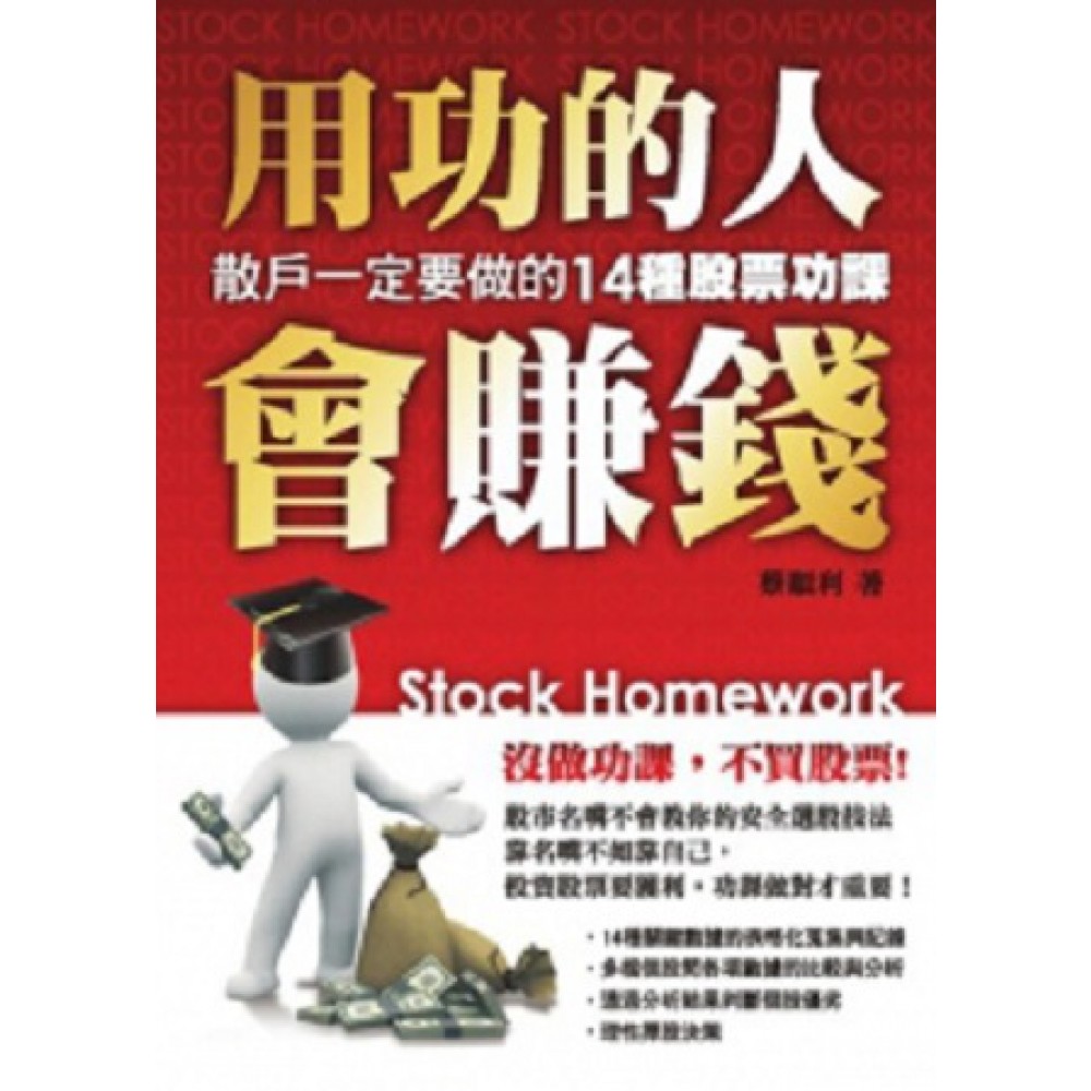 《用功的人會賺錢:散戶一定要做的14種股票功課》 聽信所謂大師的慫恿,常使小股民一輩子的積蓄血本無歸。 「我知道投資之前要做功課!」 但是,做什麼功課?功課怎麼做?電視上的股票名嘴,真的有教你嗎? K線圖?黃金交叉?乖離率?RSI? 令人頭昏腦脹的技術分析,是小股民難以跨越的障礙。 本書以一百檔以上小型股為例,將與股價息息相關的各項財務數據,化為14種股票功課;學會這14種關鍵數據分析法,透過資料蒐集、紀錄與比較,按表操課,理性選股,就能將風險降到最低,從而提高獲利,讓你不再當個股市窮忙族。 馬上就依本書內容所述之程序及要領,為您自己目前手中持股或擬於近期買進之個股實施一次「健康檢查」吧!個股本質終將良窳立判,無所遁形! 本書特色 股市名嘴不會教你的安全選股技法 -靠名嘴不如靠自己,投資股票要獲利,功課做對才重要! .14種關鍵數據的表格化蒐集與記錄 .多檔個股間各項數據的比較與分析 .透過分析結果判斷個股優劣 .理性擇股決策