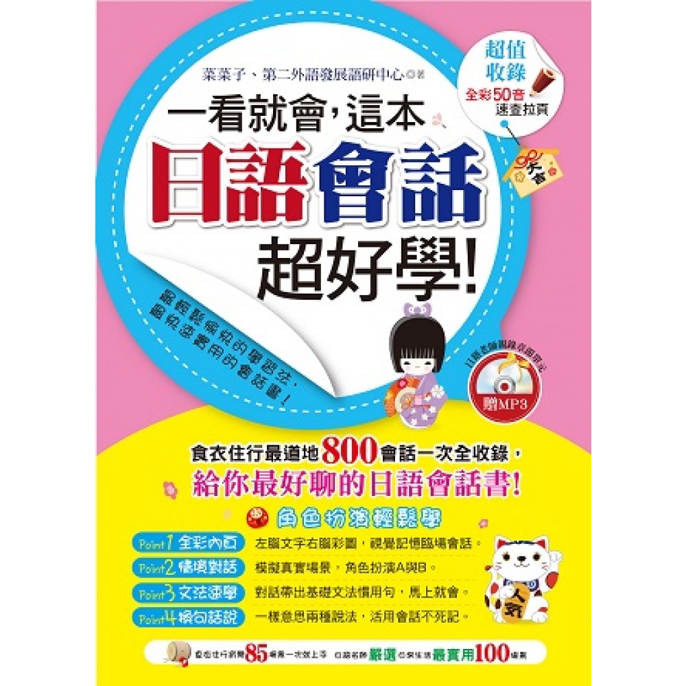 Unit 1 居家 第 1景 玄關 我出門囉! 第 2景 玄關 我回來啦! 第 3景 客廳 木村的新戲在第八台。 第 4景 客廳 喝杯茶好嗎? 第 5景 電話 您好!這裡是木村家。 第 6景 電話 請問英雄在家嗎? 第 7景 飯廳 今天好豐盛啊! 第 8景 飯廳 我吃不下了。 第 9景 廚房 今天做什麼菜呢? 第10景 廚房 垃圾要確實分類喔! 第11景 陽台 毛衣用乾洗劑洗。 第12景 陽台 洗的衣服沒有乾耶。 第13景 書桌 用電腦打電動。 第14景 書桌 今天想把哈利波特看完。 第15景 臥室 晚安!我關燈囉! 第16景 臥室 啊啊~沒睡飽。 第17景 浴室 按摩浴缸要怎麼用啊? 第18景 浴室 媽,沒衛生紙了! Unit 2 交通 第19景 公車站 有人插隊! 第20景 公車上 妳在哪裡下車呢? 第21景 捷運車站 先按鈕再投錢。 第22景 捷運上 下一站是台北車站。 第23景 計程車 叫計程車吧! 第24景 計程車上 請在和平東路右轉。 第25景 步行 這麼熱,走路很累耶! 第26景 十字路口 一直不變綠燈耶! 第27景 加油站 加油站的服務很好 第28景 車內衛星導航 下個交流道下去吧! 第29景 休息站 妳帶地圖來了嗎? Unit 3 工作 第30景 公司大廳 你今天的氣色不太好耶。 第31景 電梯 客滿了,等下一班電梯吧? 第32景 社長室 下午的行程是什麼? 第33景 辦公桌 我去小田山公司討論企劃。 第34景 辦公桌 我請他回您電話。 第35景 電腦 我馬上確認電子郵件。 第36景 電腦 中午要怎麼解決呢? 第37景 影印機 要用多大的紙印呢? 第38景 印表機 最近印表機的狀況很糟耶。 第39景 接待室 我帶您到會客室。 第40景 接待室 讓您久等了,真是對不起。 第41景 部長室 打擾了。您叫我嗎? 第42景 部長室 這個月的業績拿來了。 第43景 茶水間 客人說不要咖啡要日本茶耶! 第44景 茶水間 聽說甲斐小姐訂婚了喔! 第45景 視訊會議室 會議室的簡報準備完成了。 第46景 視訊會議室 麥克風有點怪怪的。 第47景 櫃檯 韓國客戶的估價單還沒來呢。 Unit 4 外出用餐 第48景 餐廳門口 就決定吃這家吧! 第49景 等候區 歡迎光臨!請問幾位? 第50景 等候區 讓您久等了。我為您帶位。 第51景 餐桌 要套餐還是單點? 第52景 餐桌 點這樣就夠了嗎? 第53景 餐桌 再點些酒吧! 第54景 沙拉吧 沙拉吧可以吃到飽。 第55景 櫃台 我要刷卡。 第56景 櫃台 請分開結帳。 Unit 5 購物 第57景 便利商店零食區 我是公認的甜食派! 第58景 便利商店飲料區 我也常常喝喲! 第59景 超市入口處 要推車嗎? 第60景 超市蔬果區 產地直銷比較新鮮。 第61景 超市調味料區 已經過期了。 第62景 百貨公司詢問處 男裝今天開始打折。 第63景 百貨公司試衣間 我可以試穿嗎? 第64景 百貨公司修改處 改褲管大約四天。 第65景 百貨公司包裝處 蝴蝶結要哪一種顏色? 第66景 百貨公司家電區 可以指定到貨日期和送貨時間。 Unit 6 人際關係 第67景 巷弄裡 今天是假日加班。 第68景 學校 報告寫完啦? 第69景 語言補習班 就要日語檢定考了。 第70景 學校餐廳 我想送康乃馨和禮物。 第71景 書店 請給我日語檢定考的報名表。 第72景 麵包店 請問你有集點卡嗎? 第73景 文具店 已經買了明年的筆記本。 第74景 漫畫王 你看過『陰陽師』的漫畫嗎? 第75景 唱片行 我最喜歡日本的流行歌曲。 第76景 旅行社 我想預約機票。 第77景 精品店 這個名牌包包,好貴喔! 第78景 圖書館 借書請先在哪裡申請卡片。 第79景 MSN 真理上線了! Unit 7 休閒生活 第80景 遊樂中心 我們來拍大頭貼啦! 第81景 電影院 你有想看的電影嗎? 第82景 美術館 好久沒來美術館了。 第83景 動物園 企鵝生小孩了呢! 第84景 咖啡廳 我要黑咖啡。 第85景 茶館 依這裡寫的步驟泡茶吧! 第86景 夜市 你敢吃路邊攤嗎? 第87景 寵物店 兔子好像不容易養。 第88景 花店 我想買花。 第89景 結婚典禮 日本的慶賀袋就是紅包。 第90景 KTV 生日派對在KTV。 第91景 健身房 我只做健身器材。 第92景 公園 你每天做便當嗎? 第93景 游泳池 今天的目標是自由式25公尺。 第94景 郵局 郵資總共是52元。 第95景 銀行 我想要把台幣換成日幣。 第96景 機場 出發請到B6登機門。 第97景 醫院 前天晚上開始發燒。 第98景 寺廟 我想算算戀愛運耶! 第99景 美容院 麻煩妳幫我剪髮及染髮。 第100景 精油專賣店 芳香療法,可以舒壓喔。