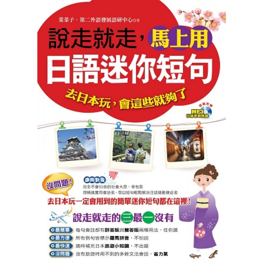 適用對象 完全不會50音的社會大眾‧背包客‧ 想精進實用會話者‧ 想以短句輕鬆解決日語疑難雜症者 超值附贈 日籍老師親錄MP3 去日本玩,不論是跟團還是自由行,你都可能: 1.懶得學句型 2.不想背用不到的單字 3.只想學幾句簡單日語吃喝玩樂 沒問題! 去日本玩一定會用到的簡單迷你短句都在這裡! 說走就走的三最一沒有 最簡單:每句會話都有詳答版與簡答版兩種用法,任你選 最方便:所有例句皆標示羅馬拼音,不怕說 最快速:適時補充日本旅遊小知識,不出錯 沒問題:沒有旅遊時用不到的多餘文法會話,省力氣 ── 旅遊資訊 入境檢查 住宿登記 購物用餐 交通工具 急難救助 這本帶著走,日本輕鬆遊 關鍵對話 列出旅遊命中率最高的主題對話內容,即查即用。 應援會話 每句皆附有詳答版與懶人最愛簡答版,一魚二吃! 作者小提醒 貼心提醒旅遊時的注意事項,減少突發狀況開心玩。 羅馬拼音對照 不會50音也能馬上唸出正確日文發音,現學現用! 旅遊必備用句 嚴選七大主題、三附錄單元,解決想說卻說不出口的痛苦。 贈送MP3光碟 無論在日本還是在台灣,隨時隨地加強日語聽說力! 讓你的旅遊日語溝通力,一句即通!