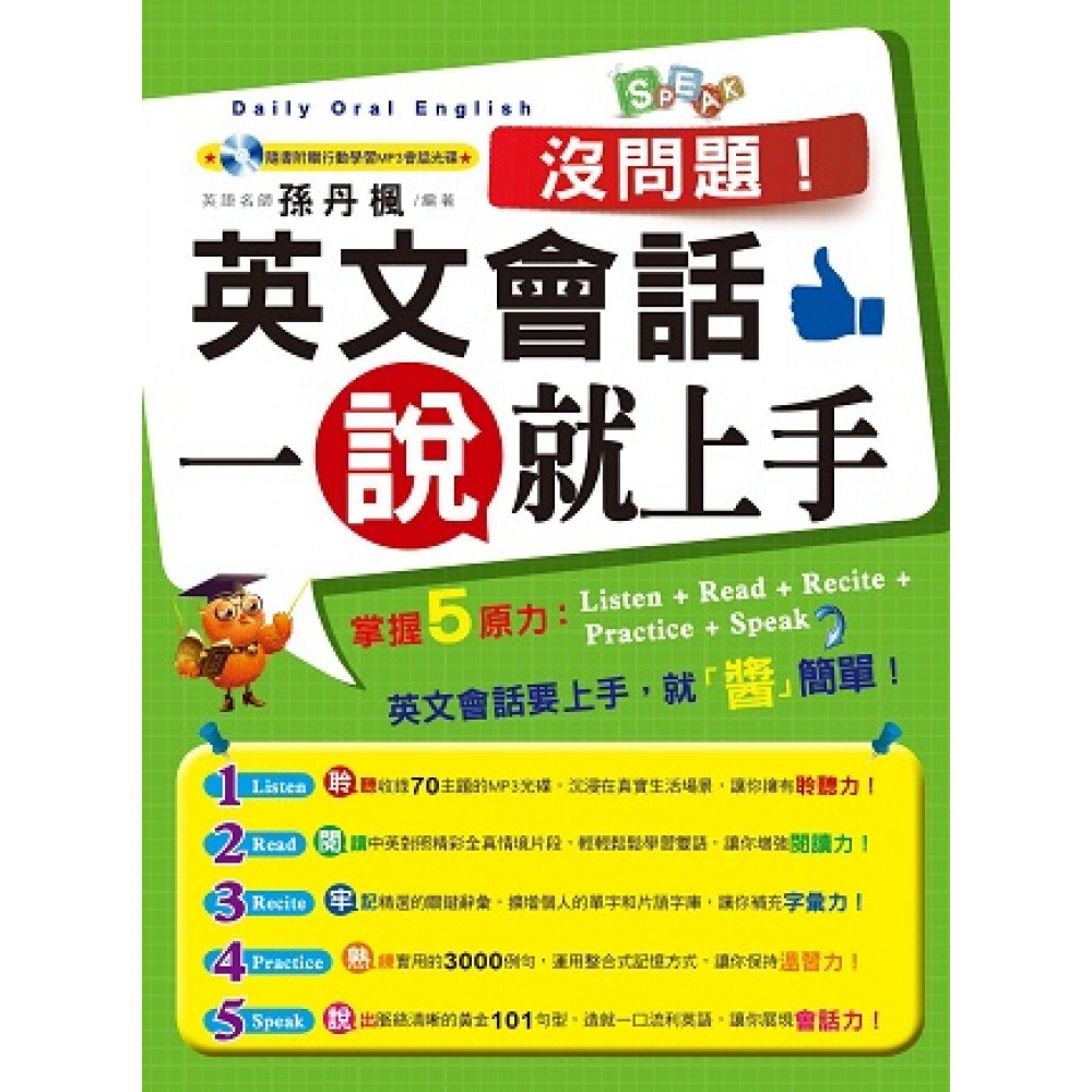 【本書特色】 本書讓您: 隨口援引3000例句與老外哈啦閒聊! 輕鬆說出101黃金句型沒問題! 豐富的內容 => ★ 最實用的生活會話:精挑細選的會話,涵蓋各種生活場景,呈現雙人、多人全真情境對話。 ★ 最道地的英文口語:收納慣用語法,讓你開口不再擔心自己的英語不道地。 ★ 最全面的知識講解:最常用的單字、詞性、句型、文法,逐一詳細講解。 ★ 最簡單的學習方法:可以自修、也可以找尋夥伴練習英語對話,既簡單又經濟實惠。 ★ 最方便的學習工具:隨書附贈的MP3光碟,收錄輕鬆活潑的會話內容,用聽的就能學,無論通學還是通勤,善加利用零碎時間,讓學英語更輕鬆、更方便。 ★ 最豐富的學習資料:收編最常用英語口語三千句,信手拈來,讓你想說就說。 ★ 多元主題學習内容:全書卅五個單元,分不同主題編輯成的精彩對話,增進英文口語能力沒問題。 讓讀者掌握五原力 => ★ 擁有聆聽力! ★ 增強閱讀力! ★ 補充字彙力! ★ 保持溫習力! ★ 展現會話力!