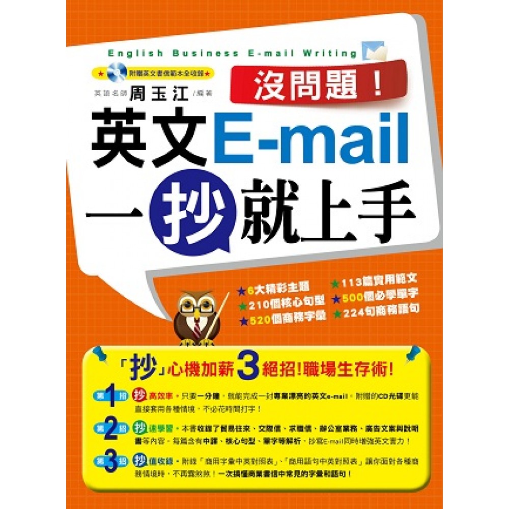 英文E-mail 一抄就會! 還在為了怎麼撰寫商務E-mail苦惱不已嗎?在多年的教學經驗中,筆者發現成人學習英文的動機除了興趣,大多數是為了工作需求,希望在職場上得心應手。近年來台灣與世界各國貿易往來頻繁,雙方幾乎仰賴英文E-mail來進行大部分的商業活動,與客戶、廠商、行銷人員、代理商、供應商、銀行家、船主、保險公司等等溝通往來。白領階級使用英文溝通的技巧變得越來越重要,因為每一封送出的信件都代表著公司以及你個人的形象。 有鑑於此,書信寫作的用字遣詞必須小心、謹慎,同時更需要花心思判斷格式、內文長度、語氣、使用場合、開頭語、結尾語、問候語,以及如何讓顧客留下好印象,各方皆考慮周到後再下筆。然而在分秒必爭的商場上,往往沒有多餘時間供你完成一封兼具專業、流暢、得體的英文E-mail。學生們不時反應因為工作時間的壓迫,難有此閒情逸致坐下來從頭紮根,好好學習。種種條件限制驅使我開始思索,要如何編寫一本內容詳盡、專業,又能使讀者有效率撰寫英文E-mail的英文工具書。 《沒問題!英文E-mail 一抄就上手》就是為了幫助上班族在時間和效率的龐大壓力之下,也能讓一封封專業、俐落的英文E-mail於焉誕生。 這本書針對商務寫作中最常見的主題,共分成六大Part和附錄: ★Part1「你一定要知道的寫作知識」先介紹英文書信的基本知識、寫作技巧、原則以及英式與美式寫法的差異。 ★ Part 2 ~ 6 收錄了各種情境模擬的英文寫作範例,均以簡潔、禮貌、準確為寫作原則。包含「貿易往來」、「交際信」、「求職信」、「辦公室業務」、「廣告文案與說明書」等主題。 ★特別收錄「商業英語常用字彙與語句」讓讀者能隨時查詢商務字彙,或套用商務用語在各種商務情境。 而本書的架構組織,從實用範文、中譯、再詳細地分析和解釋文章中每個核心句型與重點單字,一步步讓讀者掌握商用英文書信寫作思維。希望這本書真的能帶給你許多收穫,並且讓寫信給外國客戶成為一件輕鬆、容易的事情。 Enjoy it!