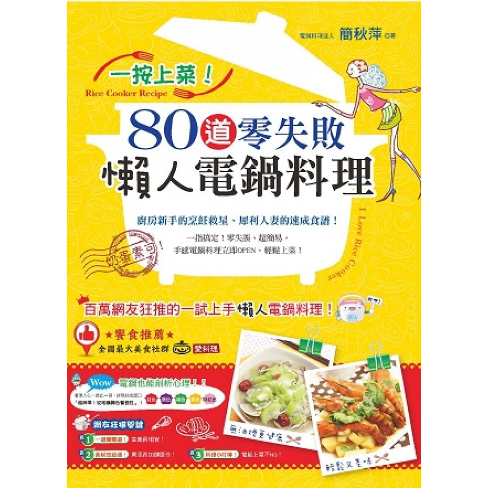 作者序 啟動電鍋的好食味蕾 導讀 電鍋菜的不敗潛規則 Chapter 1 電鍋好料Show Time~飯麵主食按上桌 Menu 1 用蒸的美味炒飯~彩色蔬菜蛋炒飯 Menu 2滿滿小魚的鮮味飯~吻仔魚電鍋燜飯 Menu 3 懶人版的法式鮭魚飯~奶香鮭魚蔬菜燉飯 Menu 4 忙碌人的快速料理~日式干貝炊飯 Menu 5 浪漫的紫色情懷~和風紫藷鮮菇飯 Menu 6 不用熬煮的偷甲步稀飯~蔥香鮪魚粥 Menu 7 電鍋米飯新味覺~雜燴香菜飯 Menu 8 營養滿分的簡易拌飯~鮭魚菇香鬆拌飯 Menu 9 調理包也能千變萬化~百變調理包炒麵 Menu 10經典芽菜雙響炮~海陸雙芽糙米飯 Chapter 2 電鍋好料Show Time~海鮮肉食按上桌 Menu 11 宴客料理必備菜~櫻花蝦絲瓜蛋盅 Menu 12 胃口大開拌飯小幫手~蛋黃瓜仔肉 Menu 13 低卡清爽無負擔~蔥花蝦香嫩豆腐 Menu 14 回憶當年的古早味料理~蔥花樹子魚 Menu 15絲瓜蛤蜊的美麗激盪~薑味蛤蜊絲瓜 Menu 17 無煙少油多健康~沙茶木耳肉排 Menu 18 百吃不厭野餐新菜色~香蔬雞肉捲 Menu 19 黃綠雙球的料理奇蹟~雙色香肉丸 Menu 20 深夜食堂下酒菜~軟Q蘿蔔滷牛筋 Menu 21美好新食光~蠔油香菇雞 Menu 22低脂省荷包料理~辣味肉絲拌菇 Menu 23輕甜酸辣泰味風~泰式酸辣蝦 Menu 24 港式飲茶的必備點心~豆鼓鳳爪 Menu 25自製手工家鄉味~古早味豆腐捲 Menu 26意想不到的涮嘴口感~三杯豬肉南瓜捲 Menu 27 夏日時尚新菜色~酸甜筍夾鯛片 Menu 28 山寨版豆干包~豆腐包鑲豬 Menu 29 入口即化新口感~馬鈴薯燉雞腿 Menu 30 豬肉與豆腐的完美融合~豬肉豆腐盤 Menu 31 少油減膩的日常小菜~蠔油紫茄 Menu 32 菇界的美味雙霸天~黑胡椒奶油雙菇 Menu 33 Q彈蝦肉新滋味~咖哩明蝦盤 Menu 34 軟嫩牛筋的誕生~牛筋木耳豆腐煲 Menu 35 簡單DIY日常配菜~美味三色蛋 Menu 36 省瓦斯的燉煮料理~可樂滷豬腳 Menu 37 肥蟹變身另類肉丸~秋蟹豆腐丸 Menu 38 一掃飯量家常菜~咖哩焗肉片 Menu 39 最佳宵夜新選擇~煙燻雞翅 Menu 40 大廚最愛前菜料理~鮭魚松菇蘆筍捲 Menu 41 電鍋料理也能異國風~義式白醬蟹肉 Menu 42 10分鐘立即上菜~香蒸金針枸杞 Menu 43 增強免疫棒料理~梅菜苦瓜肉 Menu 44 電鍋讓硬牛腱也變軟~軟Q香嫩滷牛腱 Menu 45 超美味的金瓜料理~南瓜排骨肉 Menu 46 清爽脆口下飯菜~蒜泥肉片 Menu 47 電鍋醬煮也美味~日式冰糖小管 Menu 48 回憶婆婆的家鄉菜~甜梅菜魚片 Menu 49 酒味四溢無法擋~紅棗紹興蝦 Menu 50 不費功的宴客料理~小巧蝦漿菇包 Chapter 3電鍋好料Show Time~簡易湯品按上桌 Menu 51 菜心罐頭大變身~菜心燉雞湯 Menu 52 秋冬補品上菜-補益烏骨雞湯 Menu 53 營養豐富大雜燴~日式健康蔬菜鍋 Menu 54 簡易省時的清爽湯補品~蛤蜊絲瓜湯 Menu 55 傳說中的永結同心料理~豬心枸杞湯 Menu 56 窩心暖身大補湯~四神燕麥湯 Menu 57 徜徉日本的大海湯品~鮮蝦昆布湯 Menu 58 生理期後的補益佳品~破布子四物雞湯 Menu 59 適合給重口味的你~蒜頭虱目魚湯 Menu 60不乾澀的軟嫩鴨肉~豆醬燉鴨 Chapter 4電鍋好料Show Time~甜品糕點按上桌 Menu 61 不用烤箱也能做蛋糕~卡士達奶油鬆糕 Menu 62 冰淇淋的無蛋版蛋糕~日式抹茶糕 Menu 63電鍋版濃郁起司蛋糕~香濃芝司樂蛋糕 Menu 64 來自澎湖的黑糖味~電鍋黑糖糕 Menu 65 低脂高纖輕甜點~優酪燕麥糕 Menu 66 小時候的甜品記憶~葡萄乾甜飯 Menu 67 猴子也想咬一口的糕點~香蕉蛋糕 Menu 68 一鍋搞定飯後甜點~綠豆蒟蒻湯 Menu 69 輕鬆無負擔的低卡甜點~蜂蜜蒸蛋糕 Menu 70 養生又健康的營養糕點~紅棗龍眼杯子蛋糕 Menu 71 暖呼呼的冬季甜湯~薑汁黑糖番薯湯 Menu 72 香濃可口好甜粥~電鍋八寶粥 Menu 73 不用搗到手軟也Q彈~電鍋麻糬 Menu 74 不用雞蛋的Kuso布丁~奶香米布丁 Menu 75 用電鍋也有牽絲口感~鮪魚披薩 Menu 76 無水烹煮蒸蛋糕~草莓蛋糕 Menu 77 濃郁可口的法式口感~巧克力布朗尼 Menu 78 保證零失敗的簡易甜點~焦糖布丁 Menu 79電鍋版古早豆香味~傳統豆花 Menu 80 隨時都能吃的冬至甜點~酒釀湯圓