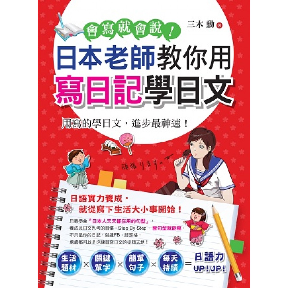 用寫的學日文,進步最神速! 日語實力養成,就從寫下生活大小事開始! 跟著本書一起學,利用現學的單字與句型, 慢慢養成以日文思考、用日文表達的習慣, Step By Step ,只要學會「日本人天天都在用的句型」, 套句型就能寫,用簡單句子寫日記, 不只是你的日記,就連FB、部落格, 處處都可以是你練習寫日文的塗鴉天地! 生活題材×關鍵單字×簡單句子×每天持續=日語力UP!UP! ○本○書○特○色 1)藉由閱讀短篇文章加強閱讀能力 本書收錄的日記全是日本老師自己的生活體驗編寫而成的,並從中了解到日本當地的風俗文化。由於文章篇幅簡短、詞句運用盡量簡單化,讀者可輕鬆培養閱讀能力,並透過老師的示範而清楚了解寫出一篇完整文章的寫作方法。 2)學習道地的日語表達方式 在每篇日記的例句中,所使用的「日本語表現」都有其文法表達及句型說明,所以在日語表達上可更清楚了解其不同點與使用方法。每個句型都會搭配例句示範及造句練習,讓讀者能快速熟悉、即學即用,學習效果加倍,輕鬆就能自己寫出小日記。 3)可記住各種場景所需具備之單字庫 收錄生活大小事即最實用的題材和情境相關聯的單字讓讀者可以舉一反三,將可藉由聯想各不同之場景之情況來學習。讓學習不再只是「單」字,而是精準表達語意的「字串」! 4)日本老師親繪插圖 每一篇小日記均搭配日本老師親手繪的插圖,幫助讀者輕鬆融入情境,增加學習樂趣!愛塗鴉的讀者們也可以學老師試著為自己寫的日記畫下插圖。 5)日記練習本 每一篇的最後,老師會出題讓讀者自己動筆寫小日記,並先示範出三句,讓讀者覺得寫日記不再是那麼難。 6)貼心的雙目錄設計 本書目錄特別設計雙目錄,除了可以從情境主題查找,也可以從文法級數或使用句型來查找讀者所需要的頁面。