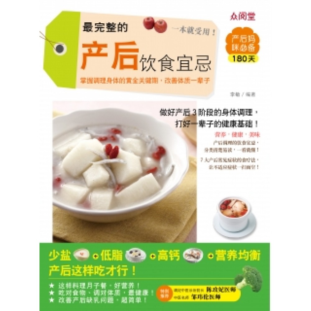 产后饮食禁忌多,大家的说法纷乱不一致, 到底哪些东西能吃?哪些东西不能吃? 现在开始不要再道听涂说了! 做好产后身体调理,打好一辈子的健康基础! ◆ 针对产褥期、哺乳期、断奶期各阶段适合吃的食材,提供最完整的营养分析。 ◆ 产后妈咪一定要吃的50道产后营养食谱,跟着简易的步骤,自己在家也能做好月子。 ◆ 专家教你产后补充营养的食材选择与搭配,在产后关键期吃对食物,享受健康一辈子。 ◆ 独家收录! 7大产后常见症状的食疗法,让产后的各种不适症一扫而空!
