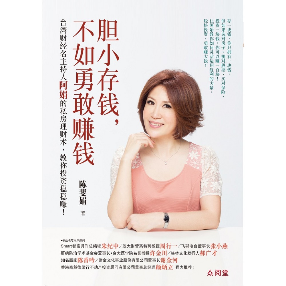 推荐序 踮起脚尖摘苹果 Smart智富月刊总编辑 朱纪中 你有采苹果的经验吗?记得念大学时,我曾到阿姨家打工,他们是台中东势的果农,在梨山上的佳阳部落种苹果。那一年的苹果收成季,他们带着我上山去采苹果。看着结实累累的果树,表哥们教我优先采收那些已经成熟的果子。根据他们的说法,长在高处的果子因为日照足,适时「套袋」后,通常色泽、口感都属一流。不过,因为生长位置较高,必须踮起脚尖、或是爬到树上才能摘下。 这个难忘的采苹果经验,让我对阿娟新书里的一段文字特别有感觉。她在书中如此写着:「人生有些事,要超出自己的能力去做……,最好是像踮脚尖摘苹果那样,得踮起来一下才摘得到,不是随手即可捻来,这样我们的能力才会在无形中成长……。」没错!就像好吃的苹果长在高处一样,人如果满脑子只想着做些「钱多、事少、离家近」的工作,事业要有成就,恐怕很难。 找工作、拚事业是如此,念书、做研究、运动、登山不也是一样,如果没有尝试挑战一些有难度的事情,人生岂不是太乏味、太无趣了!我同意,投资理财也一样,如果完全不敢担风险,只靠定存累积财富,除非本钱惊人,否则真的很难「存」出象样的成绩。相反的,如果愿意冒合理的风险,只需要踮起脚尖、不必冒很大的风险去爬楼梯或是做什么高难度的动作!硕大甜美的果实即可手到擒来。真的是如此吗?阿娟在书里提到的复利滚存试算公式,就值得大家拿来仔细研究一下。 很多人想到投资理财,就说自己不愿冒任何风险!不过,采访股市新闻二十多年,我看到的成功者大多如阿娟所形容,他们多认为:「不要怕失败,即使大部分投资都赔了钱,也比不投资要好!」说的再直接一点,人生最大的风险就是不投资。至于成功与失败最大的分野,则在如何控制风险。控制的好,聪明人可以借钱投资赚大钱。控制的不好,一旦冲过头,则会从聪明人变成小孩玩大车的莽夫!如果我两个都不爱,完全不想冒风险、死抱现金,可不可以?答案是你同样会离成功愈来愈远,因为「通膨」将会把你手中的现金啃蚀殆尽。 面对投资理财,你会选择那一条路?希望阿娟蕴酿了两年多才完成的这本新书,能助您找到最适合的道路,跻身成为理财投资的胜利组。也期待您的人生,因为体悟「踮起脚尖摘苹果」的哲理,从此更添色彩! 推荐序 让金钱更「富有」,「心肝」更美好 肝病防治学术基金会董事长/台大医学院名誉教授 许金川 认识斐娟,是因为她当老师的母亲──黄婉琼,二十年前退休后毅然从事公益,在肝病防治学术基金会从义工做到总监,牺牲奉献,不辞辛苦,不仅要经常带领基金会同仁及志工们上山下海,全台走透透,为民众做免费肝病筛检,并且要呕心沥血,放下身段为筹募善款而努力。多年来基金会能日渐茁壮,为国人健康做出贡献,她可以说厥功至伟。而长期以来,她全家人受她感召也纷纷投入义工的行列,像三女儿斐娟(阿娟),小女儿自由时报记者陈晓宜,也都义不容辞为基金会尽心出力,尤其斐娟,我看着她由十多年前的初生之犊,靠着自己的念书进修,不仅拜师苦练标准闽南语,成为专业电视主播,更努力自修考取证券分析师执照,勤奋努力,终于成为知名财经节目主持人,她的成功绝非偶然,靠着是她过人的坚持、毅力、聪明与长期奋斗使然! 知道「阿娟」要出一本理财的书,让我这个来自屏东乡下的「阿肝」医师,回想起二十多年前,因从事研究而负债数百万,并接到厂商催债的「存证信函」,当时毫无概念,不知所惧,现在想起来,真的是向天借胆,荒唐至极。基金会民国八十三年成立,我也是到最近几年才真正了解,要实现公益梦想,「勇于募款、善于理财」的必要性! 多年来,我四处演讲,其中有张投影片秀出了一大张仟元、一大张百元新台币钞票,每讲至此,台下总是睁大眼(见钱眼开吧)!我一方面借钞票上国父孙中山先生遗像及蒋中正肖像做对比,让听众了解什么是肝病末期的病容,一方面也借机提醒大家「家财万贯,不如健康一生」。不过,若善于理财,生活中没有金钱的压力,对「肝脏」应该是很好的! 医师,虽是专门的行业,但也只是三百六十五行当中的一行,多年来,在从事肝病防治推广工作之中,越来越觉得「隔行如隔山」,越来越感受从病人及身边各行各业朋友中吸收知识的重要,而理财,是以前我个人最不通,也不想通的一环,但基于要善用国人的爱心捐款,为基金会发挥更大的力量,现在则是不得不通,又很想通的一个罩门。此次,斐娟新书《胆小存钱,不如勇敢赚钱!》让我有了新的启发与更多的求知欲望,更希望读了本书的朋友,在金钱「富有」之后,也要关心自己及家人的健康,并进一步发挥大爱,一起为保肝志业而努力,让人人有好心「肝」,让心灵更富有,台湾更美好!阿门! 推荐序 因为钞票贬值,所以要勇敢赚钱! 财金文化事业股份有限公司董事长 谢金河 「胆小存钱,不如勇敢赚钱!」恭喜斐娟小姐出版新书!这本书在当前时空背景下出版,可说是正是时候。自从一九九○年股市从一万两千六百八十二点崩跌而下,全民疯投资理财的时代,也随着投资人在股海受到重伤害,逐渐离场,股市也逐渐式微;台湾的投资人也从股海里冲锋陷阵的勇将,进入到投资保守的阶段。 很多人不敢把钱放在股市里,只好回头买基金,也有人把钱放到银行存定存,也有人买点黄金等增值。这几年最显著的变化是炒房,很多人会说,买股票赚