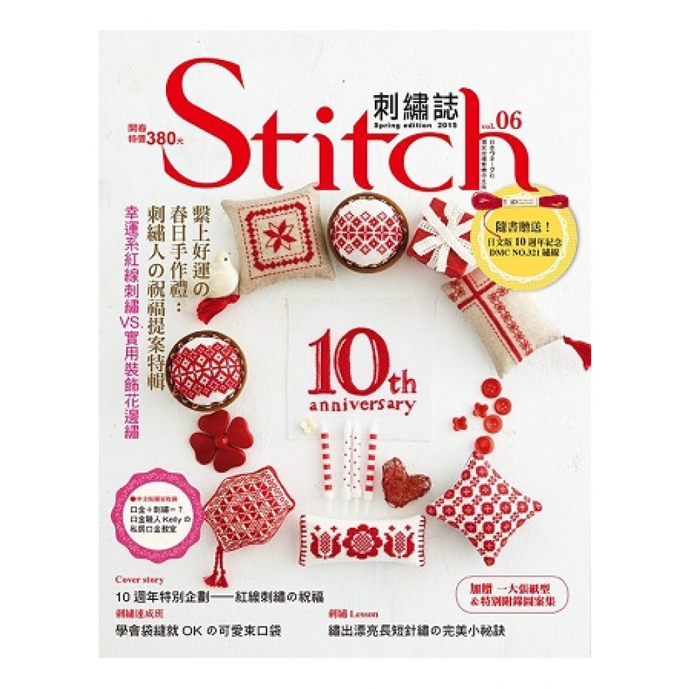 日本知名超人氣刺繡雜誌【ステッチidees】 日本Vogue社首度獨家授權台灣繁體中文版第六輯 ★隨書贈送刺繡誌日文版10週年紀念DMC NO.321繡線★ 在充滿節慶氣息的繽紛冬日, 準備好迎接春天的禮物了嗎? 刺繡誌中文版第六輯 為您嚴選70件繫上好運的刺繡手作, 獨一無二的手製祝福, 絕對是創意送禮的首選NO.1! 搭配刺繡誌日文版10週年紀念, 本期特別贈送 DMC法國米路斯工廠第一次染製的NO.321號紅色繡線, 喜愛刺繡的您,一定要擁有! *特集1:回憶刺繡 收錄七位人氣刺繡作家的經典作品,與您分享最動人的刺繡故事。 *特集2:特殊節慶刺繡 一年四季,過節小禮物可不能少!自己動手作最有誠意! *特集3:連續圖案刺繡 以實用的裝飾花邊繡為手作小物添加浪漫新風采吧! *話題連載!青木和子の小小刺繡之旅 Vol.4河田ヒロ小姐 *刺繡小祕密 繡出漂亮長短針繡の完美小祕訣 *刺繡速成班 學會袋縫就OKの可愛束口袋! *黑線刺繡 享受愉快の單色繡樂趣 ●刺繡作家的手作日常:川畑杏奈、薗部裕子 玄關、臥室、客廳、廚房、兒童房....都是刺繡的溫暖好所在。 ●日本最新刺繡手作情報:懷舊&可愛の刺繡再發現! 刺繡檔案「溫柔の刺繡」 ●實用可愛原創附錄圖案:超值收錄「特別附錄圖案集+圖案紙型」 滿足刺繡人的手作心! ●繁體中文版獨家收錄「口金包+刺繡=?」 台灣超人氣作家「口金職人Kellyの私房教室」好評連載中! ●拜訪巴黎十字繡設計家──Perrette Samouïloff小姐 Stitch刺繡誌繁體中文版,顛覆以往刺繡只能成為藝術品的刻板印象,收錄了70件以上由人氣刺繡作家製作設計,以刺繡裝飾的居家物品、布作、室內陳設、衣物改造、收納小物等,給你更多實用刺繡作品的手作好點子! 收錄詳細彩色繡法示範及作法解說,並貼心附上基礎繡法圖示,讓想從頭學起的新手們,也能照著書中作法一起動手製作,隨書特別附錄兩大張原寸紙型,對於已有刺繡程度的進階者,也能應用於作品設計或啟發更多圖案的靈感! 只要準備「布、針、線」三大元素,刺繡就能隨身帶著作! 打造簡單的刺繡新生活,就是這麼與眾不同!