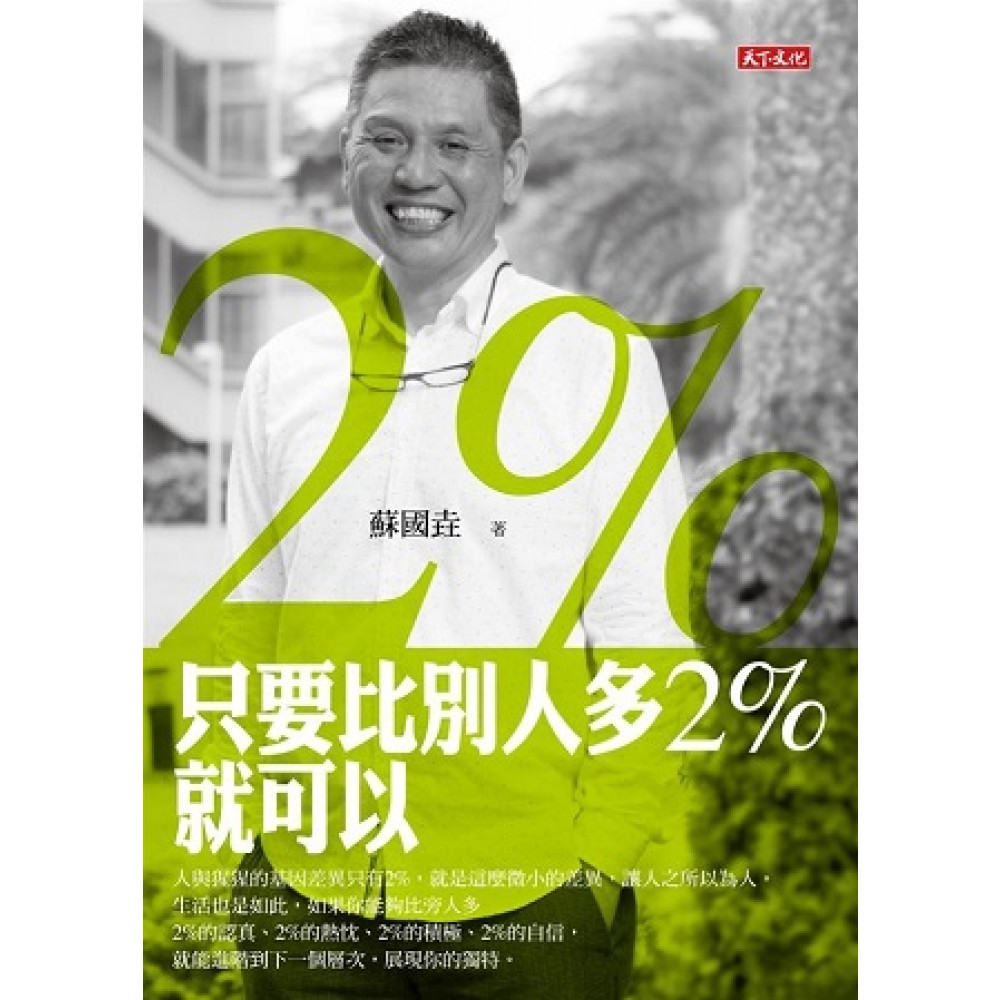 人與猩猩的基因差異只有2%,就是這麼微小的差異,讓人之所以為人。 生活也是如此,如果你能夠比旁人多2%的認真、2%的熱忱、2%的積極、2%的自信, 就能進階到下一個層次,展現你的獨特。 比別人多2%的祕訣—— ★看他的壞,學他的好 ★工作向上比,生活向下比 ★想是問題,做才是答案 ★人生不是藍圖,是拼圖 「正在讀這本書的你,很可能一輩子沒有人讚美過你, 但我一定要告訴你:有你真好。 我想幫你們打光,在你們的優點上打圈圈。 你願意打開這本書看,讓我們有機會交流,不是很棒嗎?」——蘇國垚 擔任過五星級飯店總經理的蘇國垚,在旅館界一片扼腕聲中,毅然轉任教職,因為當老師才是他人生的志業。 嚴長壽少了接班人,高雄餐旅大學卻多了一位超人氣教師。 他將「五星級的服務精神」帶入校園,把每個學生都當成他的「客戶」,連畢業十年的學生還享有他的「售後服務」!難怪聽過他演講的企業老闆都忍不住呼喊:我好想當蘇老師的學生啊! 蘇國垚在高雄餐旅大學任教這十年間,看著年輕的學生來來去去,與他們深談、交心,明白了他們的處境與跌跌撞撞的模樣,有令人心疼、擔憂的孩子,也有需要激勵、嚴厲提點的年輕人。 他決定為他們寫下這本書,讓他們在奮鬥的過程中,能有個老師陪著,要拍拍給拍拍,要聽笑話給笑話,讀過這本書,可以充飽了氣,信心滿滿地繼續向前進擊。